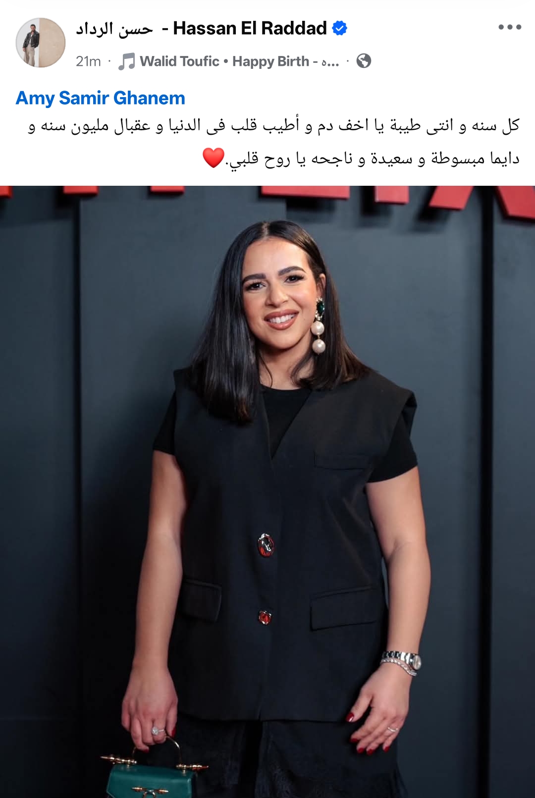 وكتب حسن الرداد من خلال حسابه الرسمي عبر موقع التواصل الاجتماعي فيسبوك، قال: كل سنه وانتى طيبة يا اخف دم و أطيب قلب فى الدنيا و عقبال مليون سنه و دايما مبسوطة وسعيدة و ناجحه يا روح قلبي.
