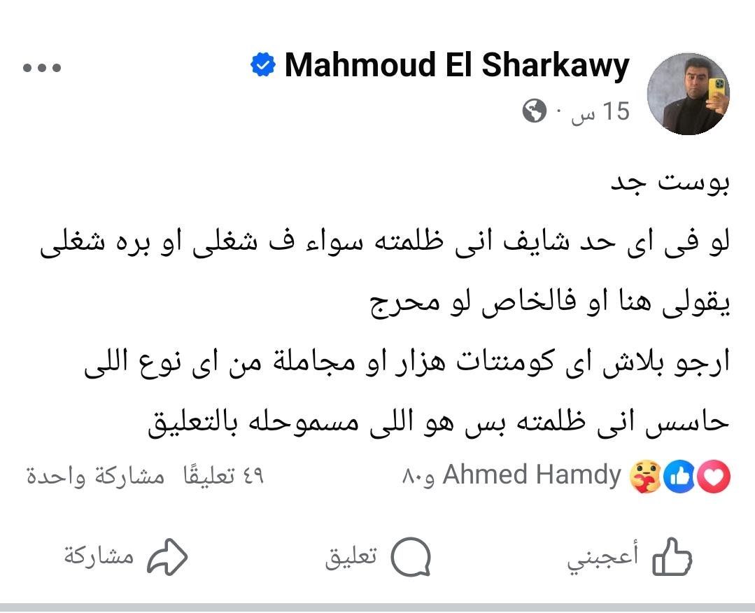 وجاء في نص المنشور: "لو في أي حد شايف إني ظلمته سواء في شغلي أو بره شغلي يقولي هنا أو في الخاص لو محرج"، مع طلبه الصريح بعدم كتابة أي تعليقات تحمل طابع المجاملة أو المزاح، والاكتفاء فقط بمن لديه شكوى حقيقية.