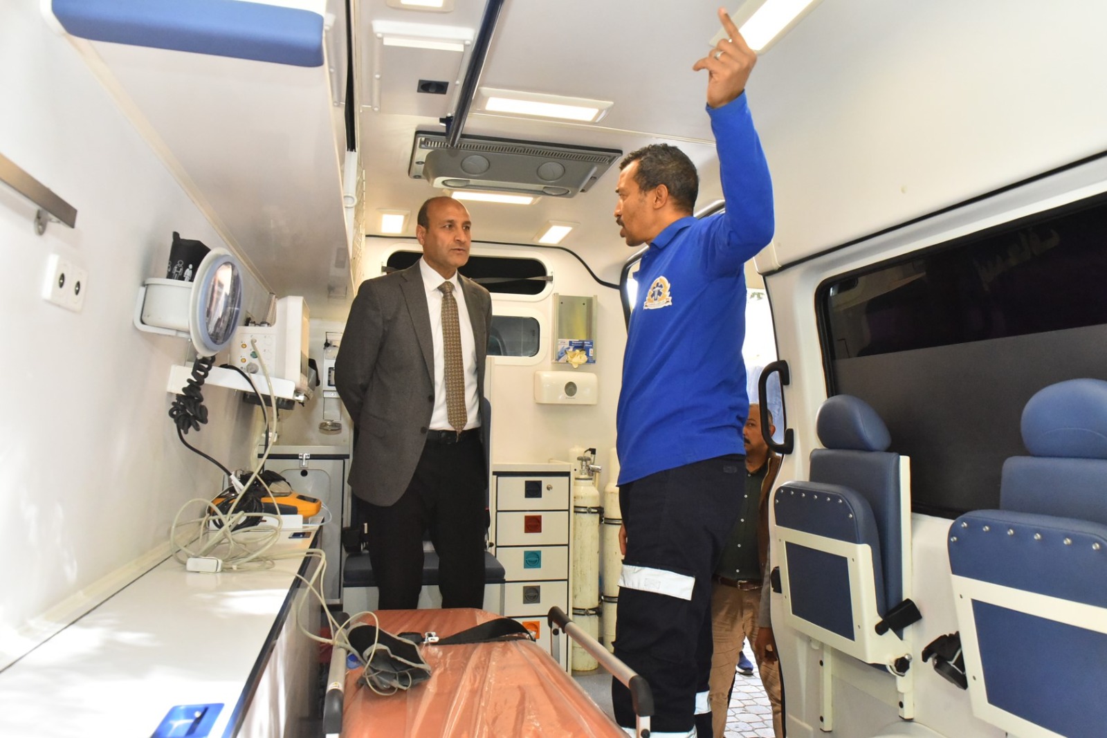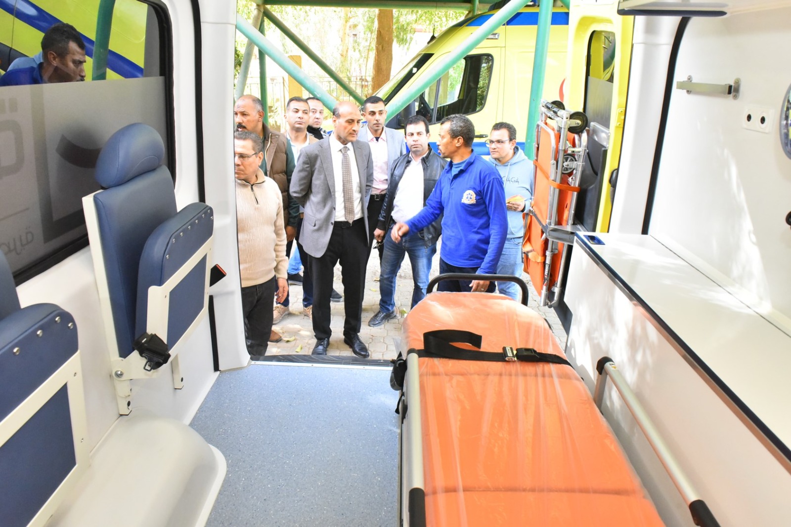 كما شملت الجولة تفقد سيارات الإسعاف المتمركزة بالموقع، والتي يبلغ عددها ثلاث سيارات مجهزة بأحدث الإمكانيات الطبية، من بينها سيارة حضانة مخصصة لنقل الأطفال المبسترين مزودة بكبسولة حديثة وأجهزة تنفس صناعي، إلى جانب سيارتين مجهزتين كوحدات عناية مركزة متنقلة، تحتويان على أجهزة إنعاش قلبي رئوي، وأجهزة صدمات كهربائية، وأجهزة متابعة حيوية (مونيتور)، فضلًا عن أجهزة رسم القلب.