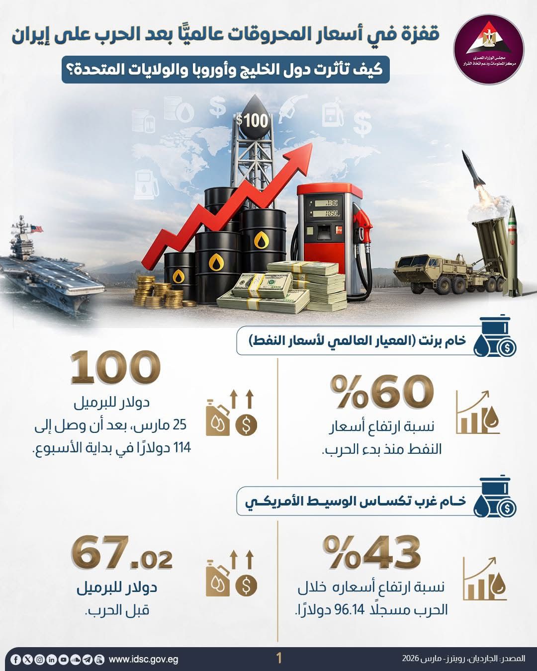وكشف مركز معلومات مجلس الوزراء، خام برنت صعد بنحو 60%، وارتفع خام غرب تكساس الوسيط بنسبة 43%، بينما شهدت أوروبا والمملكة المتحدة زيادات كبيرة في أسعار الغاز، ما زاد من الضغوط على الإمدادات ورفع تكاليف الطاقة عبر هذه الأسواق.