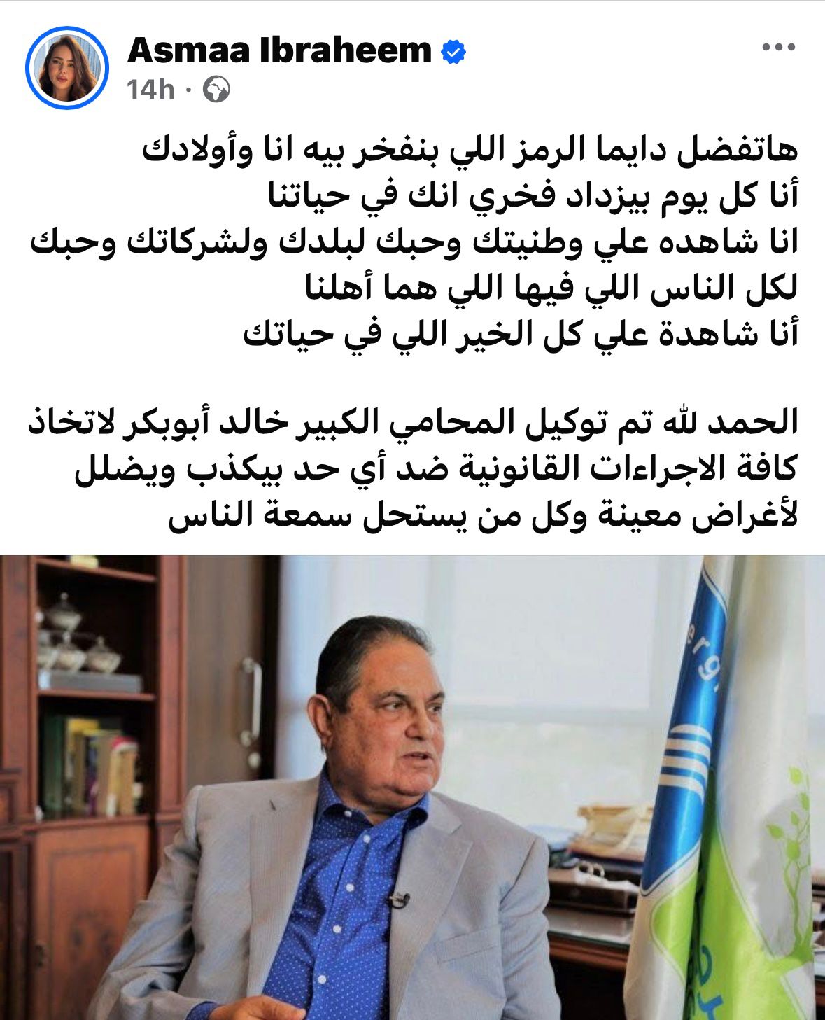 نشرت الأعلامية أسما إبراهيم مقدمة برنامج حبر سري منشورا عبر حسابها الرسمي علي علي موقع "فيسبوك" تدافع فيه عن زوجها رجل الأعمال محمد الخشن بعد اتهامه في مديونة هائلة لعدة بنوك.