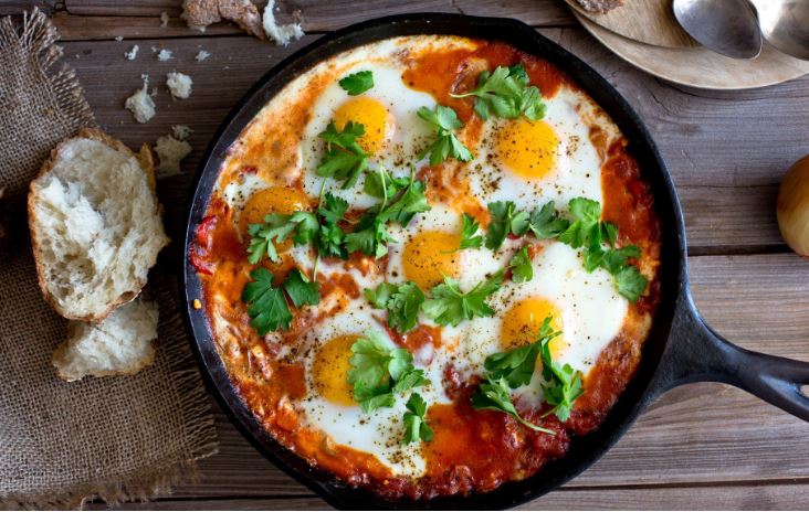 اغلقي النار وضعي فطيرة الشكشوكة في طبق التقديم مع قطع الخيار والتوست.