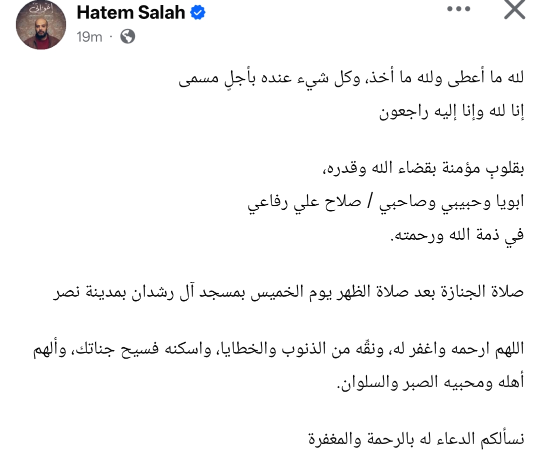 أعلن الفنان حاتم صلاح عن وفاة والده صلاح علي رفاعي، اليوم، الأربعاء، الموافق 1 أبريل.