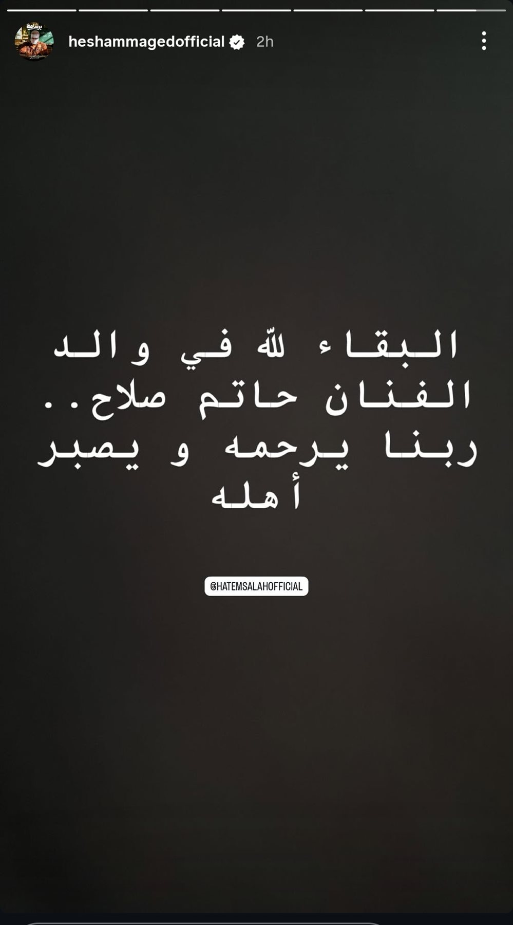 وكتب هشام ماجد من خلال حسابه الرسمي عبر موقع تبادل الصور والفيديوهات القصيرة إنستجرام، عبر خاصية ستوري، قال: البقاء لله في والد الفنان حاتم صلاح.. ربنا يرحمه ويصبر أهله.
