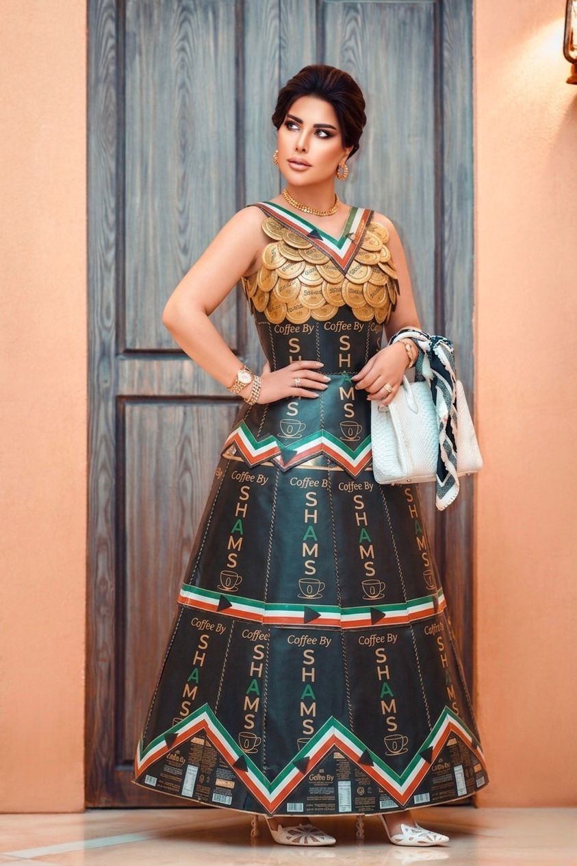 الإطلالة جاءت بتصميم جريء يجمع بين الفن والموضة، حيث تم توظيف عبوات القهوة في تشكيل فستان كامل بتفاصيل هندسية لافتة، مع لمسات ذهبية عند منطقة الصدر، وألوان مستوحاة من هوية المنتج نفسه، ما عكس دمجًا واضحًا بين التسويق والإبداع البصري.