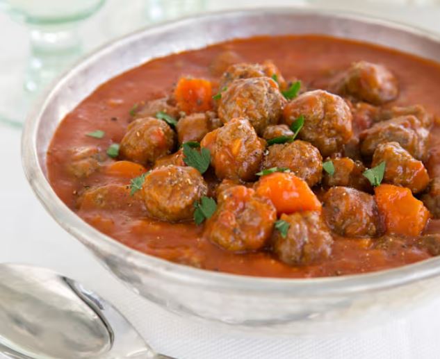 7. تُعاد كرات اللحم إلى المقلاة وتُضاف التوابل (الملح والفلفل الأسود) حسب الرغبة، ويُترك الخليط على النار حتى تتشبع كرات اللحم بالنكهات و يتماسك الصوص.
