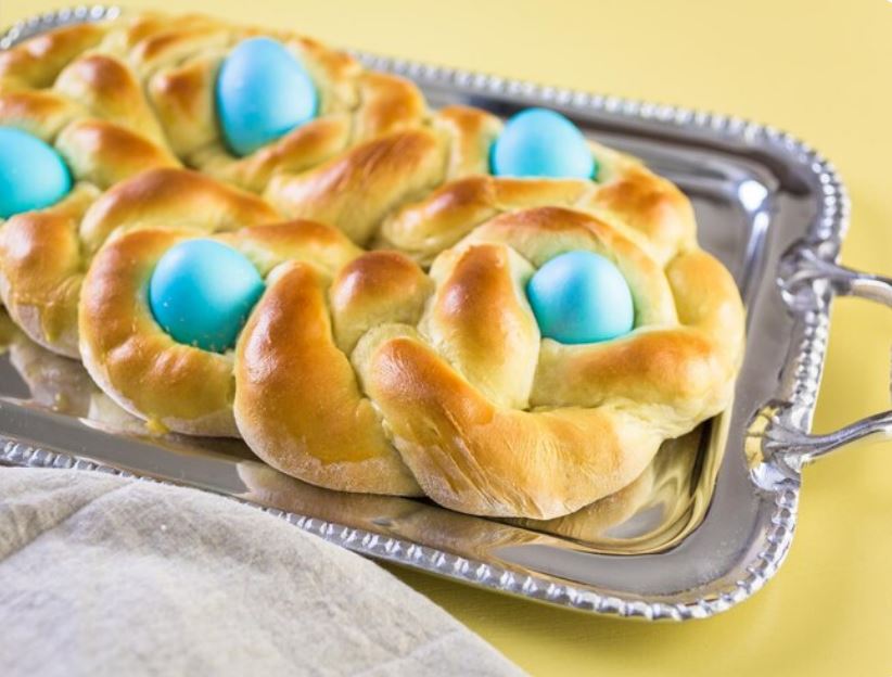 6.بعد انتهاء فترة التخمير، قسّمي العجينة إلى ثلاث قطع متساوية الحجم. قومي بتشكيل كل قطعة على شكل مستطيل، ثم ضفّري القطع معًا لتأخذ الشكل المميز للفطيرة. اتركي العجينة لتستريح مجددًا لمدة ساعة أخرى.