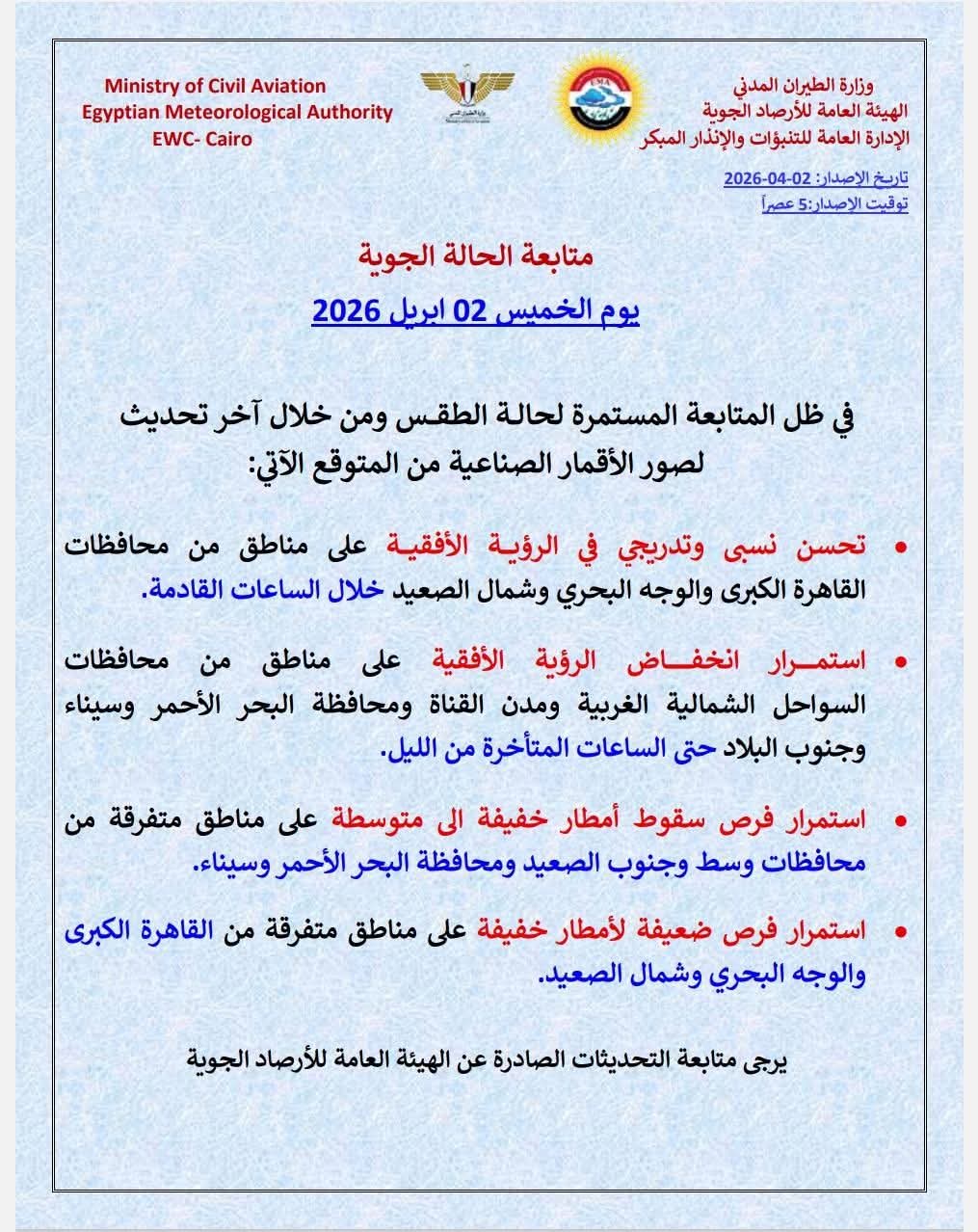 أصدرت الهيئة العامة للأرصاد الجوية تحديث جديد للحالة الجوية مساء اليوم الخميس 2 أبريل 2026، كشفت فيه عن ملامح الاستقرار التدريجي في بعض المناطق، مع استمرار التقلبات الجوية في مناطق أخرى حتى ساعات متأخرة من الليل.