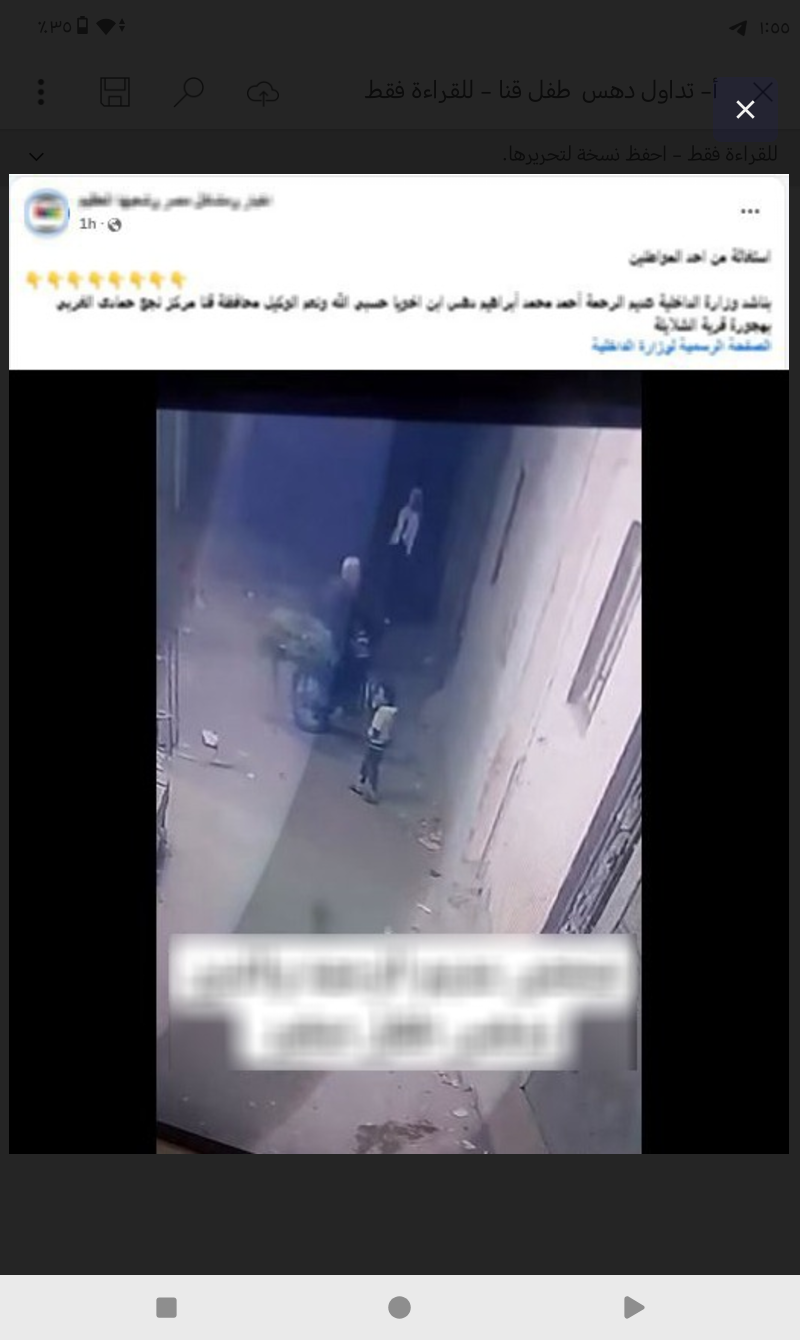 بالفحص أمكن تحديد القائم على النشر ( عم الطفل الظاهر بمقطع الفيديو– مقيم بدائرة مركز شرطة نجع حمادى) وبسؤال أهلية الطفل "والدته ، وعمه" قررا بتضررهما من قائد الدراجة النارية لمحاولته دهس الطفل عمداً بدون مبرر.