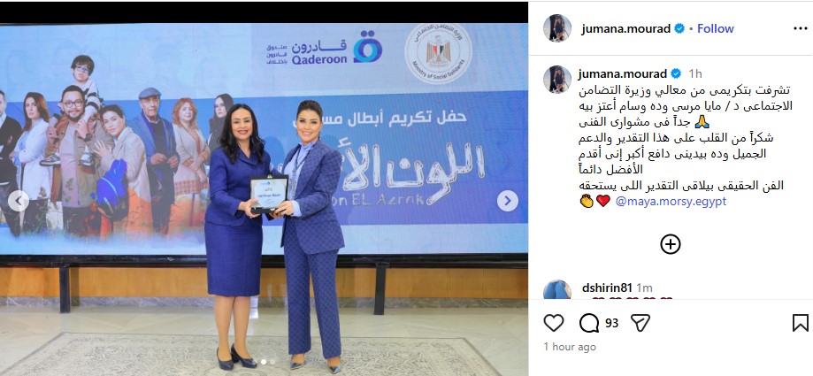 ونشرت جومانا مراد صورا من التكريم، من خلال حسابها الرسمي عبر موقع تبادل الصور والفيديوهات القصيرة إنستجرام، وكتبت: تشرفت بتكريمى من معالي وزيرة التضامن الاجتماعى د / مايا مرسى وده وسام أعتز بيه جداً فى مشوارى الفنى.