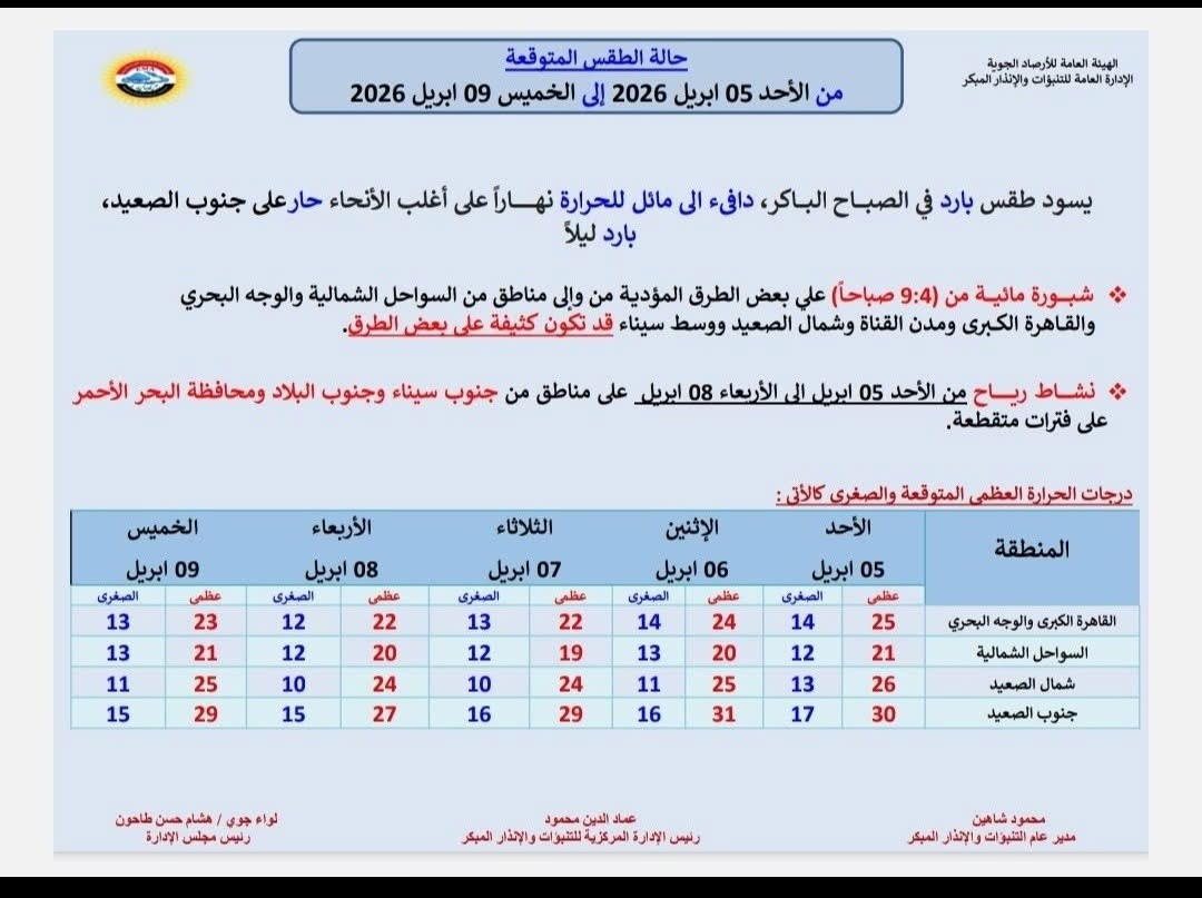 يقدم لكم موقع مصر تايمز تفاصيل حالة الطقس المتوقعة خلال الأيام المقبلة، بداية من الأحد 5 أبريل وحتى الخميس 9 أبريل 2026، وفقًا لما أعلنته الجهات المختصة بالأرصاد الجوية.
