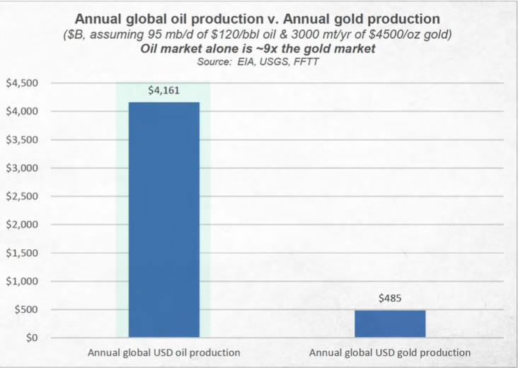 ومع ذلك، تواجه هذه النظرية عقبة هيكلية خطيرة. يُقدر حجم سوق النفط العالمي السنوي بحوالي 4.1 تريليون دولار، وهو يعادل تسعة أضعاف حجم سوق الذهب السنوي الذي يبلغ 485 مليار دولار فقط.