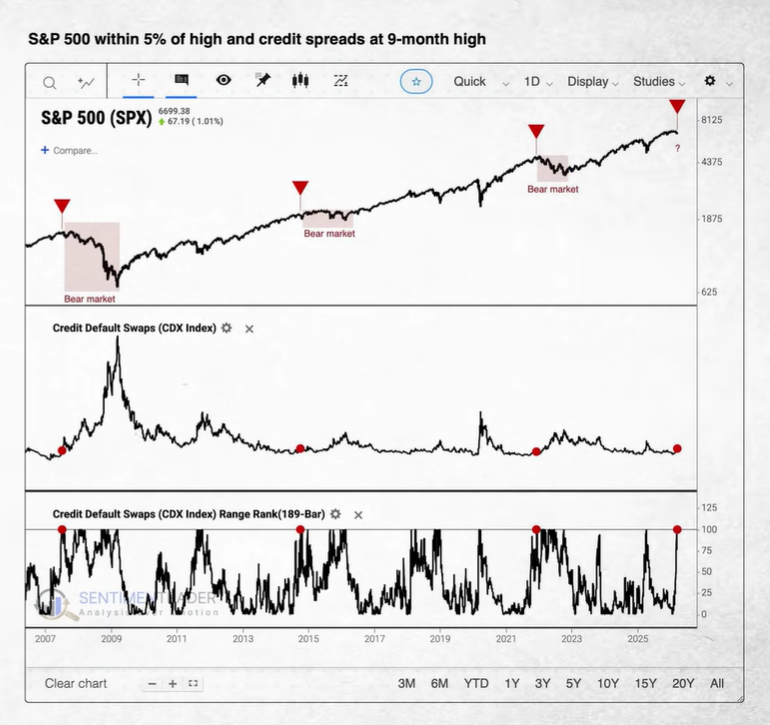 على مدى العقدين الماضيين، كلما اتسعت هوامش الائتمان بينما كانت الأسهم بالقرب من أعلى مستوياتها، تبع ذلك سوق هابطة (Bear Market) حادة وحتمية.