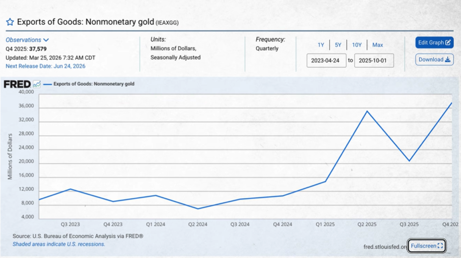 علاوة على ذلك، تشير البيانات إلى أن الولايات المتحدة نفسها زادت من صادراتها من الذهب المادي غير النقدي (Non-monetary Gold)، مما يوحي بأنها تسوي جزءاً من عجزها التجاري (Trade Deficit) بالذهب. وبذلك، تم إنشاء "بوابة تحصيل رسوم" جيوسياسية، تتطلب الدفع باليوان، والذي يدعمه الذهب أساساً.
