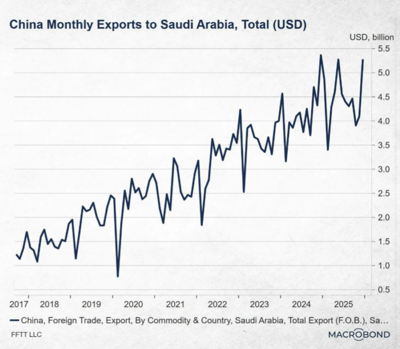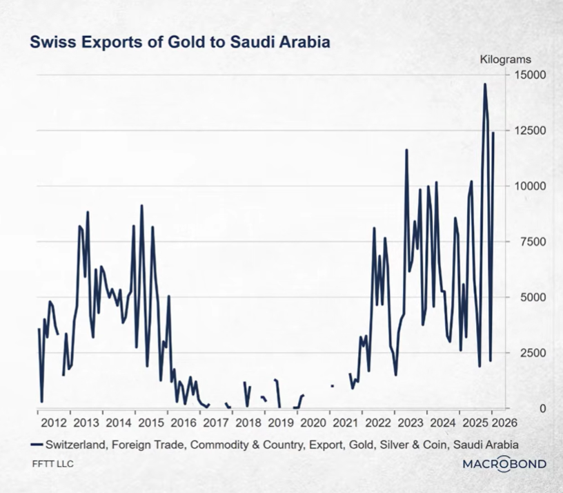 وتدعم البيانات هذا التحول نحو الأصول المادية (Hard Assets). فبعد تجميد الاحتياطيات الروسية في 2022، زادت السعودية ودول الخليج من وتيرة شراء الذهب عبر سويسرا بشكل ملحوظ. وبالتزامن، ارتفعت الصادرات الصينية إلى السعودية باطراد، مما يعكس حلقة تجارية ثنائية تزداد قوة.