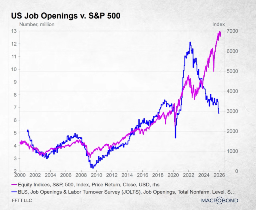 ومع ذلك، تتحدى سوق الأسهم حالياً هذا المنطق. فعلى مدار 25 عاماً، تحركت بيانات فرص العمل (JOLTS) ومؤشر S&P500 في انسجام تام زيادة الوظائف تعني زيادة الإنفاق، مما يرفع أرباح الشركات وأسعار الأسهم. أما اليوم، فهناك انفصال حاد (Divergence)؛ حيث تنهار فرص العمل، بينما يواصل مؤشر S&P500 التحليق.