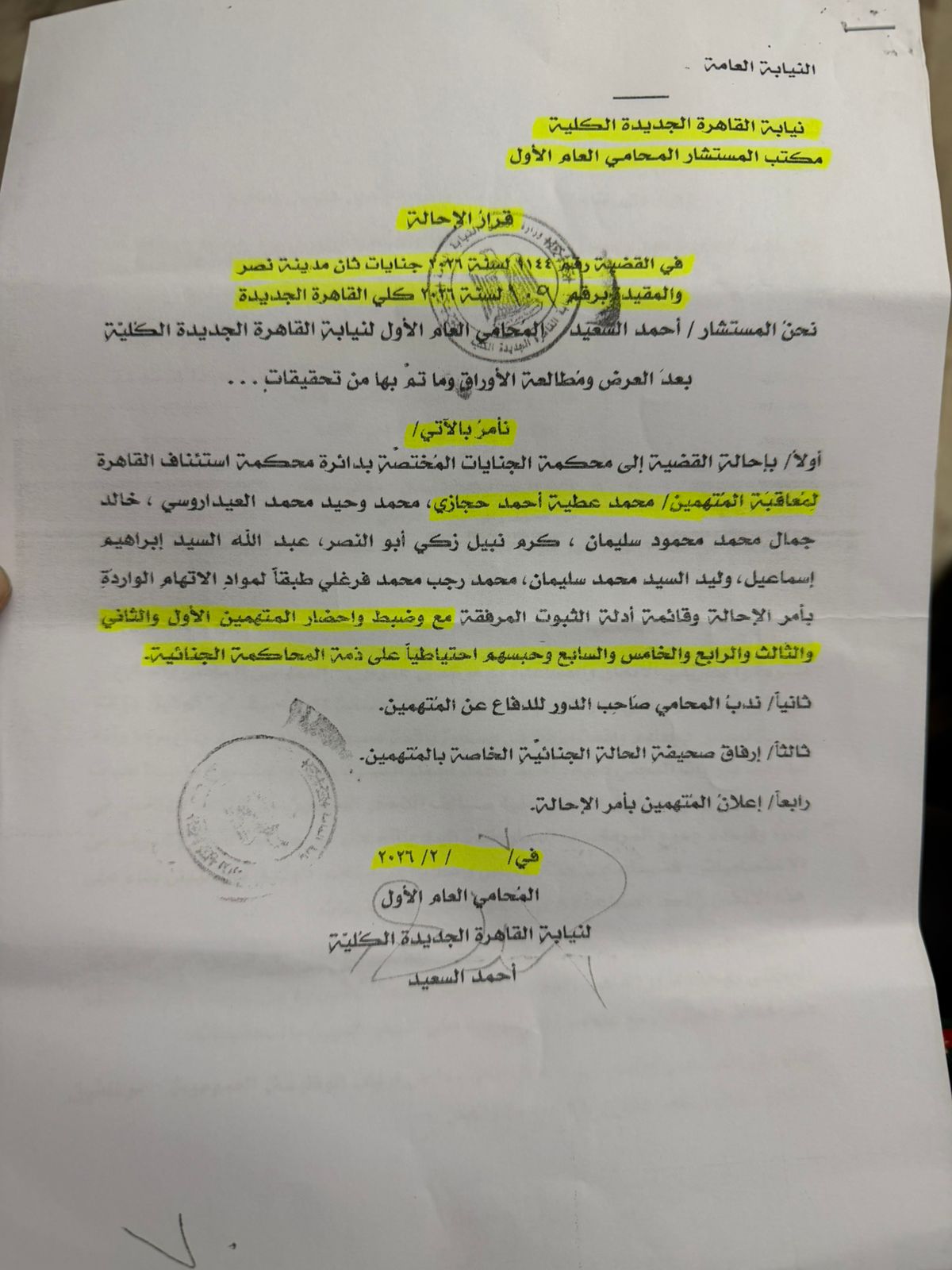 وبعد ثبوت الاتهامات أحالت النيابة أوراق القضية إلى المستشار أحمد السعيد المحامي العام الأول لنيابة القاهرة الجديدة الكلية، والذي أمر بإحالة القضية إلى محكمة الجنايات، وضبط وإحضار المتهمين الهاربين وحبسهم احتياطيا على ذمة المحاكمة، وندب محامي للدفاع عن المتهمين، وإعلان المتهمين بأمر الإحالة.