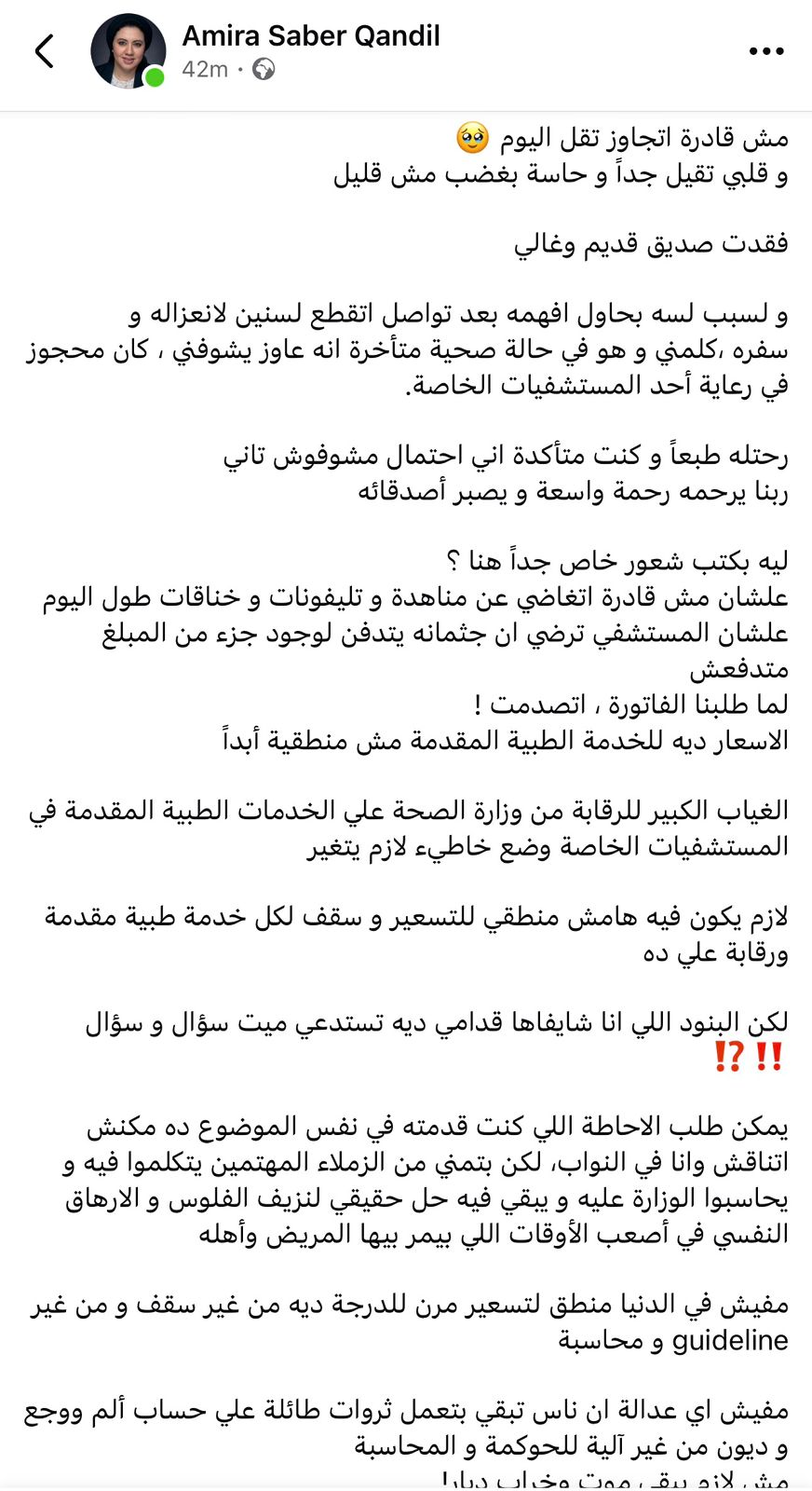 وتابعت: ليه بكتب شعور خاص جداً هنا ؟علشان مش قادرة اتغاضي عن مناهدة و تليفونات و خناقات طول اليوم علشان المستشفي ترضي ان جثمانه يتدفن لوجود جزء من المبلغ متدفعش لما طلبنا الفاتورة ، اتصدمت !الاسعار ديه للخدمة الطبية المقدمة مش منطقية أبداً الغياب الكبير للرقابة من وزارة الصحة علي الخدمات الطبية المقدمة في المستشفيات الخاصة وضع خاطيء لازم يتغير لازم يكون فيه هامش منطقي للتسعير و سقف لكل خدمة طبية مقدمة ورقابة علي ده.