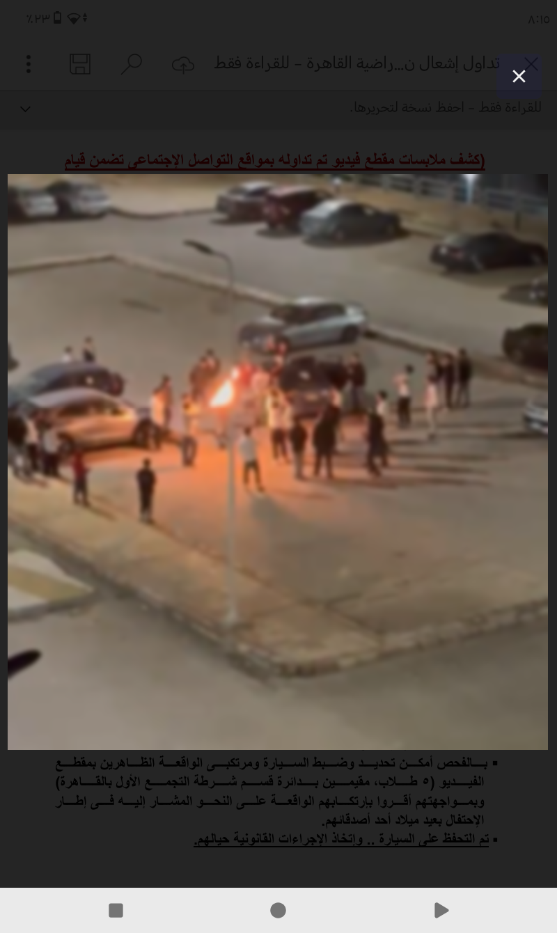 وبالفحص أمكن تحديد وضبط السيارة ومرتكبى الواقعة الظاهرين بمقطع الفيديو (5 طلاب، مقيمين بدائرة قسم شرطة التجمع الأول بالقاهرة).