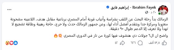 وأشار فايق عبر حسابه على فيسبوك إلى أن لاعبي الزمالك كانوا مشحونين معنوياً ومركزين بشكل كبير، وقدموا أفضل أداء لهم هذا الموسم، ما يعكس رغبتهم القوية في التتويج باللقب.