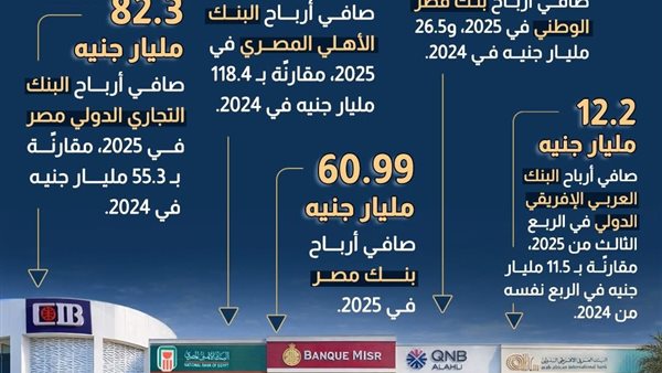 وفي السياق ذاته، أشار الإنفوجراف إلى أن أرباح بنك قطر الوطني الأهلي (QNB) ارتفعت إلى 30.1 مليار جنيه مقابل 26.5 مليار جنيه في 2024، بنسبة نمو بلغت نحو 13.6%. كما أوضح أن البنك العربي الإفريقي الدولي سجل في الربع الثالث من 2025 أرباحا قدرها 12.2 مليار جنيه مقارنة بـ 11.5 مليار جنيه في نفس الفترة من 2024، بنسبة نمو تقارب 6.1%.