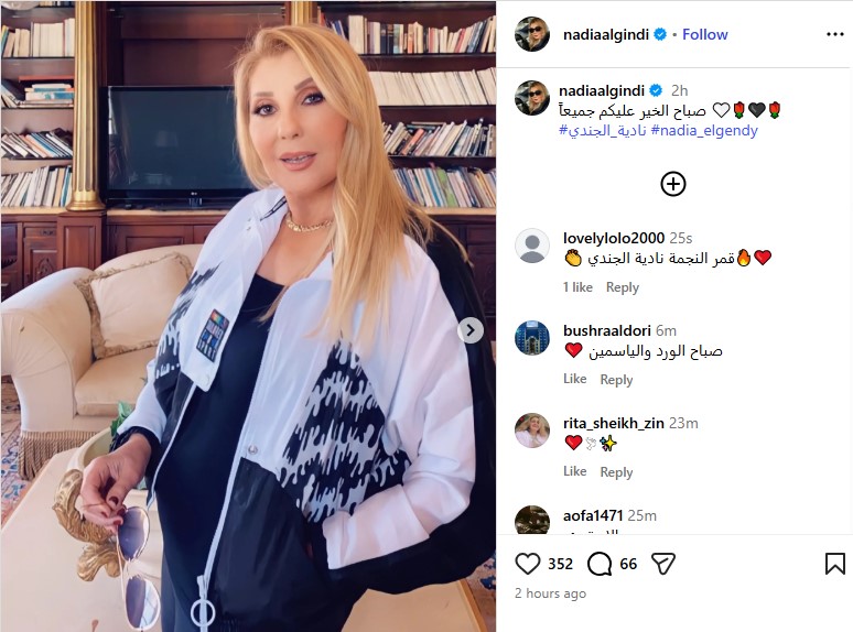 وتفاعل معها جمهورها ومحبيها، مبدين إعجابها الشديد بلياقتها البدنية، وعلقت نادية الجندي على أحدث جلسة تصوير لها من خلال حسابها الرسمي عبر موقع تبادل الصور والفيديوهات القصيرة إنستجرام: صباح الخير عليكم جميعًا.