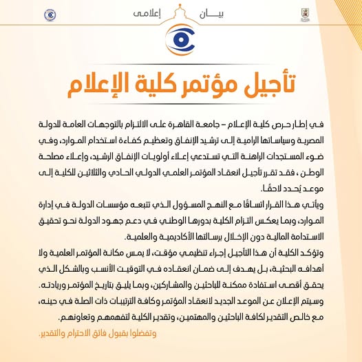 في إطار حرص كلية الإعلام – جامعة القاهرة على الالتزام بالتوجهات العامة للدولة المصرية وسياساتها الرامية إلى ترشيد الإنفاق وتعظيم كفاءة استخدام الموارد، وفي ضوء المستجدات الراهنة التي تستدعي إعلاء أولويات الإنفاق الرشيد، وإعلاء مصلحة الوطن ، فقد تقرر تأجيل انعقاد المؤتمر العلمي الدولي الحادي والثلاثين للكلية إلى موعد يُحدد لاحقًا.