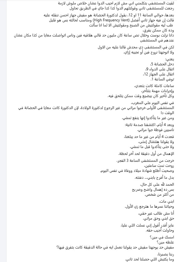 وأوضح أن الطفل تم إدخاله الحضانة في أحد المستشفيات في حلوان، نحو الساعة الخامسة مساءً، وظل تحت المتابعة لساعات، مع الإشارة إلى تأخر في اتخاذ بعض الإجراءات الطبية، وانتظار استشاري حتى قرابة الساعة التاسعة مساءً، بالإضافة إلى توصية بدواء لم يكن متوفراً داخل المستشفى قائلا بعدها حوالي الساعة 11 او 12 بقول لدكتورة الحضانة هو مفيش جهاز أحسن ننقله عليه وقالت إن فيه جهاز تاني أفضل (High Frequency Vent) ومناسب لحالته بس هو قليل، طب ليه مقولتيش من الصبح ومقولتيش إلا لما أنا سألت وده كان ممكن يفرق د أنا نزلت بوست وخلال نص ساعة كان مليون حد قالي هلاقيه فين وناس اتواصلت معايا من كذا مكان عشان عندهم في المستشفى