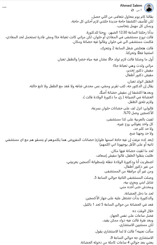 وأوضح أحمد سالم عبر منشور في فيس بوك أن البداية كانت بتوجهه إلى طبيبة في الساعة 12:30 ظهرًا، والتي أوصت بالذهاب إلى مستشفى في المعادي أو حلوان، قبل أن يتواصل مع مستشفى حلوان للتأكد من توافر حضّانة بها، حيث تم إبلاغه بوجود مكان، على أن يتم التوجه لاحقًا