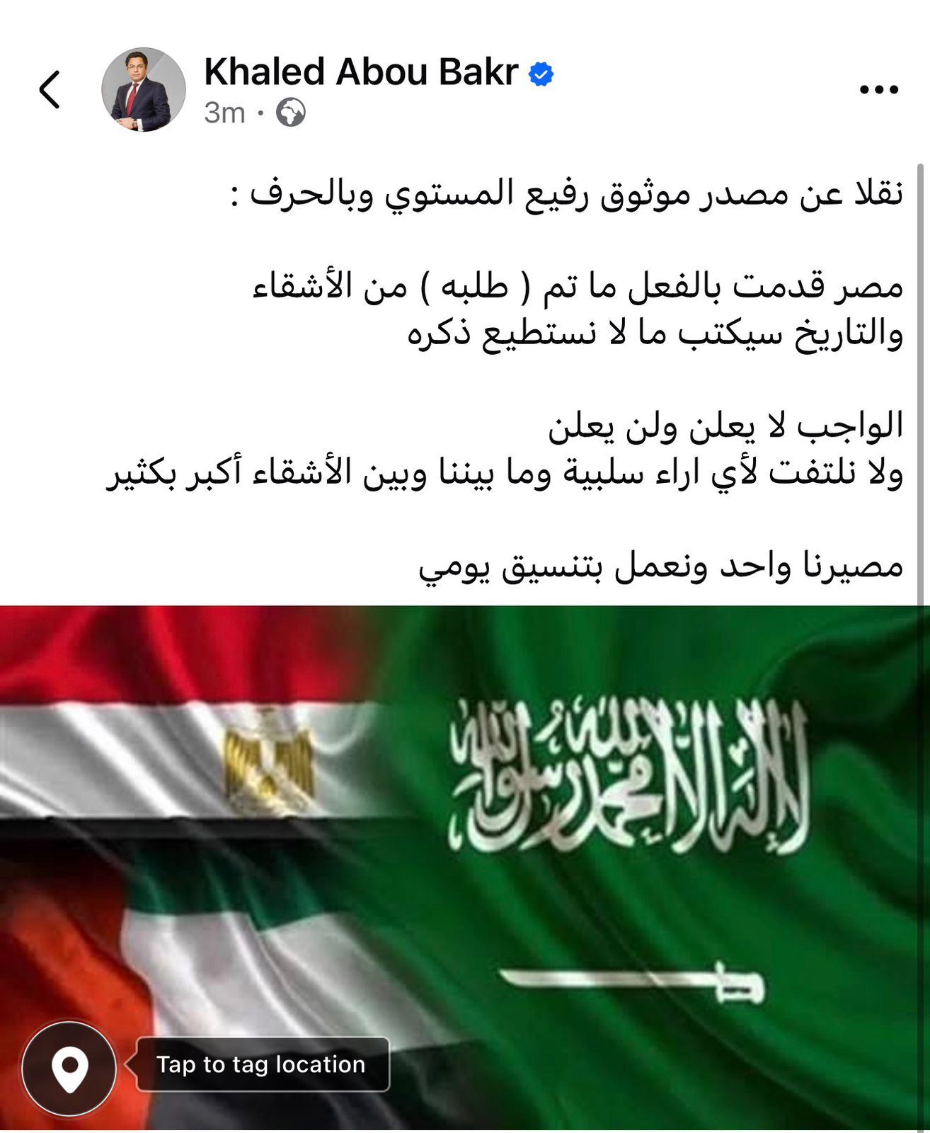 وأكد خالد أبو بكر، أن الدولة المصرية قد أوفت بالفعل بكافة الاستحقاقات والمتطلبات التي تم التنسيق بشأنها مع الأشقاء، مشدداً على أن طبيعة هذا الدور تترفع عن الاستهلاك الإعلامي؛ إذ كتب على صفحتة بموقع التواصل الاجتماعي فيسبوك "نقلا عن مصدر موثوق رفيع المستوي وبالحرف : مصر قدمت بالفعل ما تم ( طلبه ) من الأشقاء.. والتاريخ سيكتب ما لا نستطيع ذكره"،