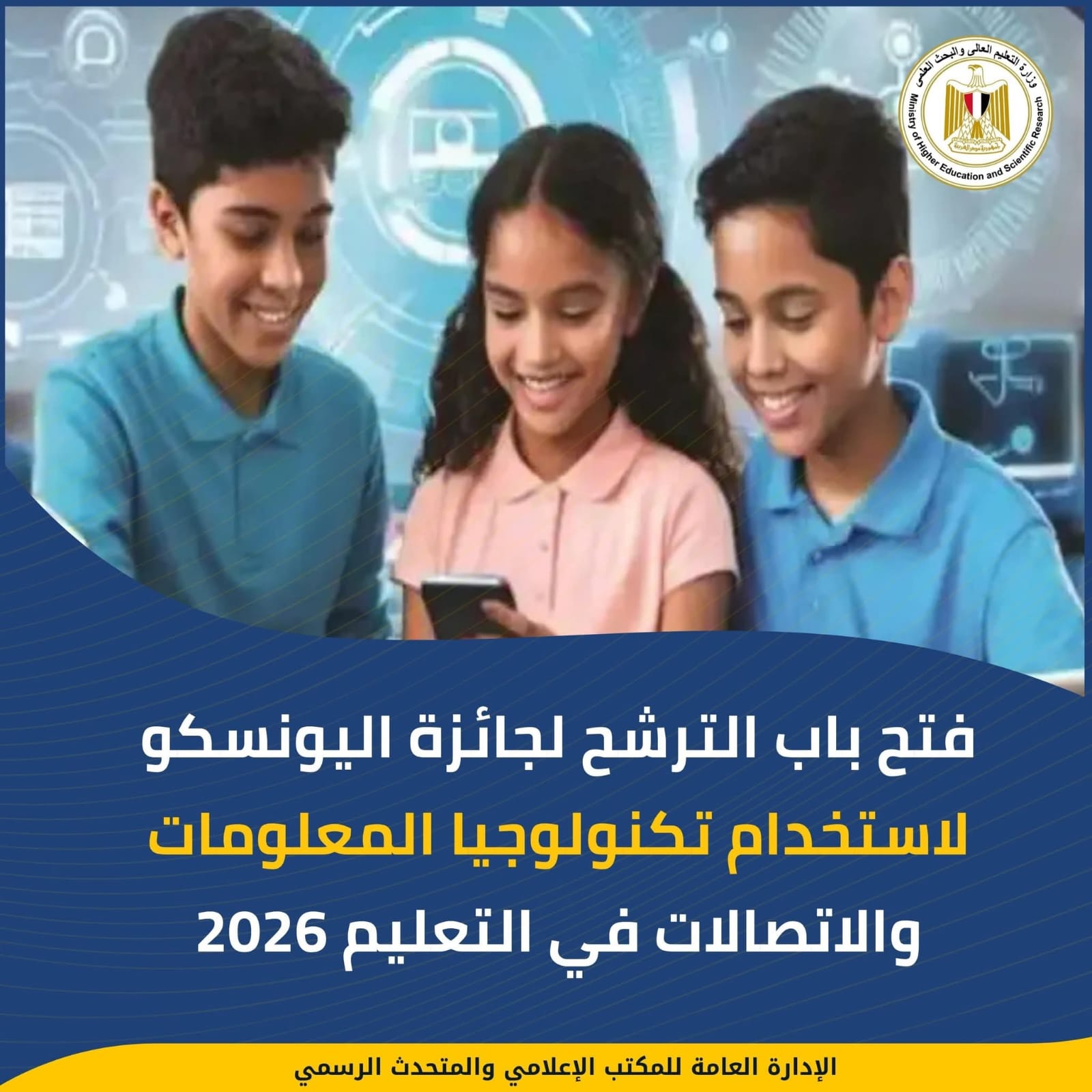 تحت رعاية الدكتور عبدالعزيز قنصوة وزير التعليم العالي والبحث العلمي ورئيس اللجنة الوطنية المصرية للتربية والعلوم والثقافة، تعلن اللجنة الوطنية المصرية لليونسكو عن فتح باب الترشح لنيل جائزة اليونسكو لاستخدام تكنولوجيا المعلومات والاتصالات في التعليم لعام 2026، والتي تأتي هذا العام تحت شعار:
