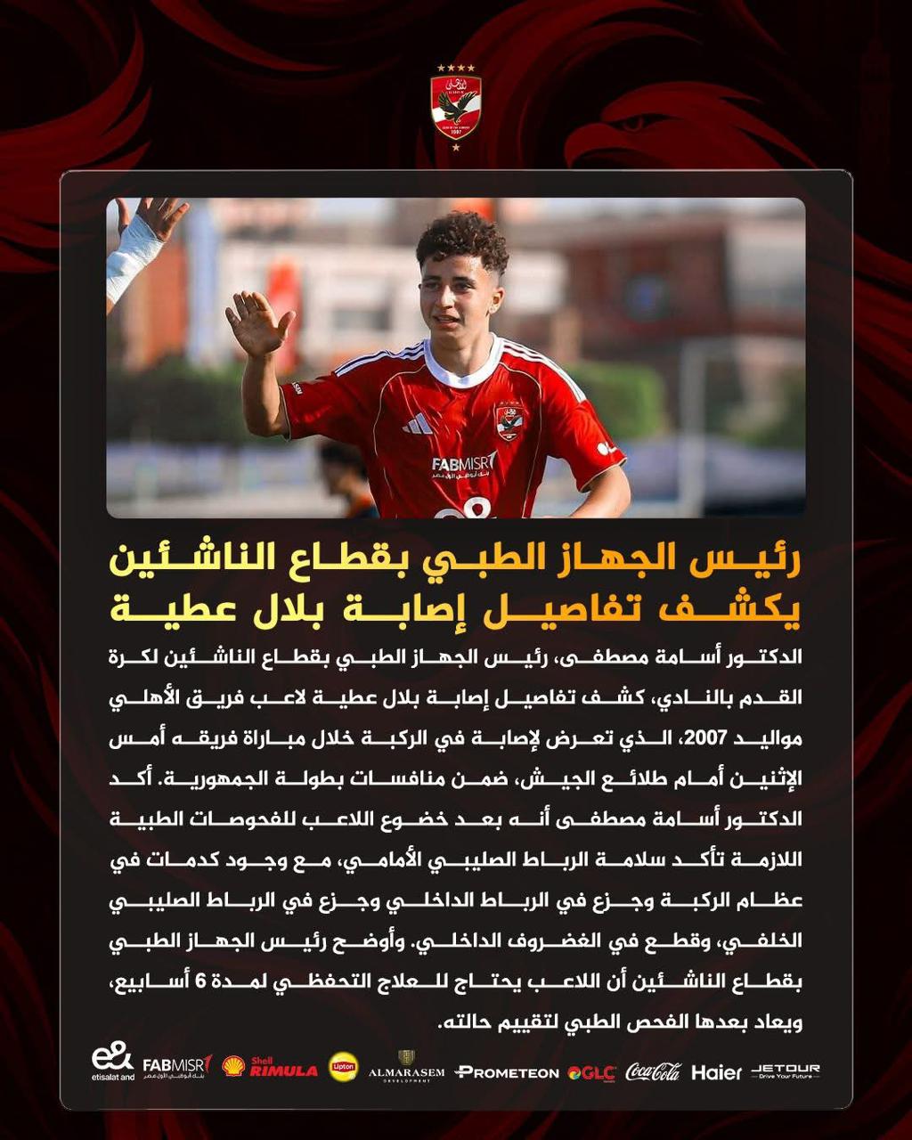 أعلن النادي الأهلي تفاصيل إصابة لاعبه بلال عطية نجم فريق الشباب مواليد 2007، التي تعرض لها مؤخرًا في بطولة دوري الشباب.
