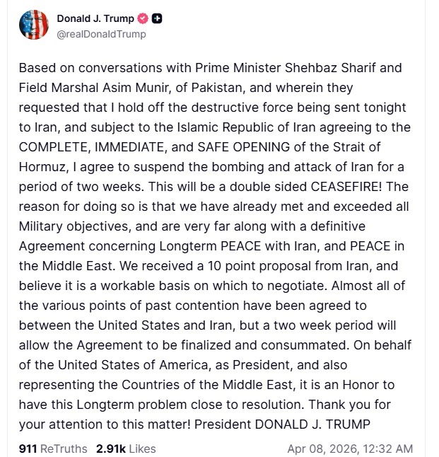 وأضاف: لقد تلقينا مقترحاً من عشر نقاط من إيران، ونعتقد أنه أساس عملي للتفاوض. تم الاتفاق على جميع نقاط الخلاف السابقة تقريباً بين الولايات المتحدة وإيران، لكن فترة الأسبوعين ستتيح إتمام الاتفاق وتفعيله، نيابةً عن الولايات المتحدة الأمريكية، بصفتي رئيسًا لها، وممثلًا أيضًا لدول الشرق الأوسط، إنه لشرفٌ لي أن أرى هذه المشكلة المزمنة تقترب من الحل. شكرًا لكم على اهتمامكم بهذا الأمر! الرئيس دونالد جيه. ترامب.