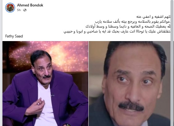 وطالب أحمد بندق من الجمهور الدعاء له وأعرب عن أمنياته بالشفاء العاجل، وكتب من خلال حسابه الرسمي عبر موقع التواصل الاجتماعي فيسبوك، قال: اللهم اشفيه و اعفي عنه، دعواتكم يقوم بالسلامه ويرجع بيته بألف سلامه يارب، الله يعطيك الصحه و العافيه و دايما وسطنا و وسط أولادك، متقلقناش عليك يا توحااا انت عارف بحبك قد ايه يا صاحبي و ابويا و حبيبي.