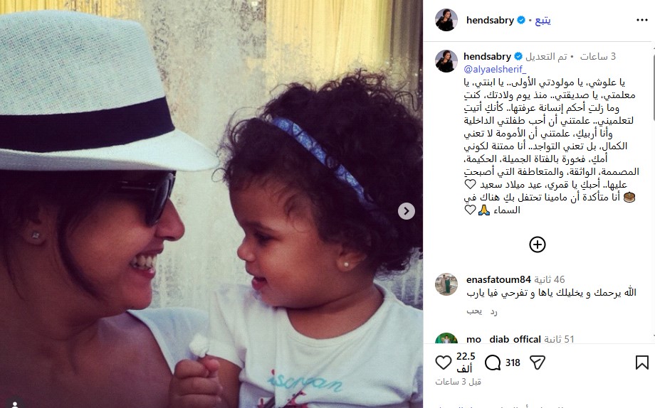 وشاركت هند صبري جمهورها صورا تجمعها بابنتها منذ الطفولة، كما وجهت من خلالها رسالة تُعبر فيها عن حبها وامتنانها لها، وكتبت من خلال حسابها الرسمي عبر موقع تبادل الصور والفيديوهات القصيرة إنستجرام: يا علوشي، يا مولودتي الأولى.. يا ابنتي، يا معلمتي، يا صديقتي.. منذ يوم ولادتك، كنتِ وما زلتِ أحكم إنسانة عرفتها.. كأنكِ أتيتِ لتعلميني.. علمتني أن أحب طفلتي الداخلية وأنا أربيكِ، علمتني أن الأمومة لا تعني الكمال، بل تعني التواجد.