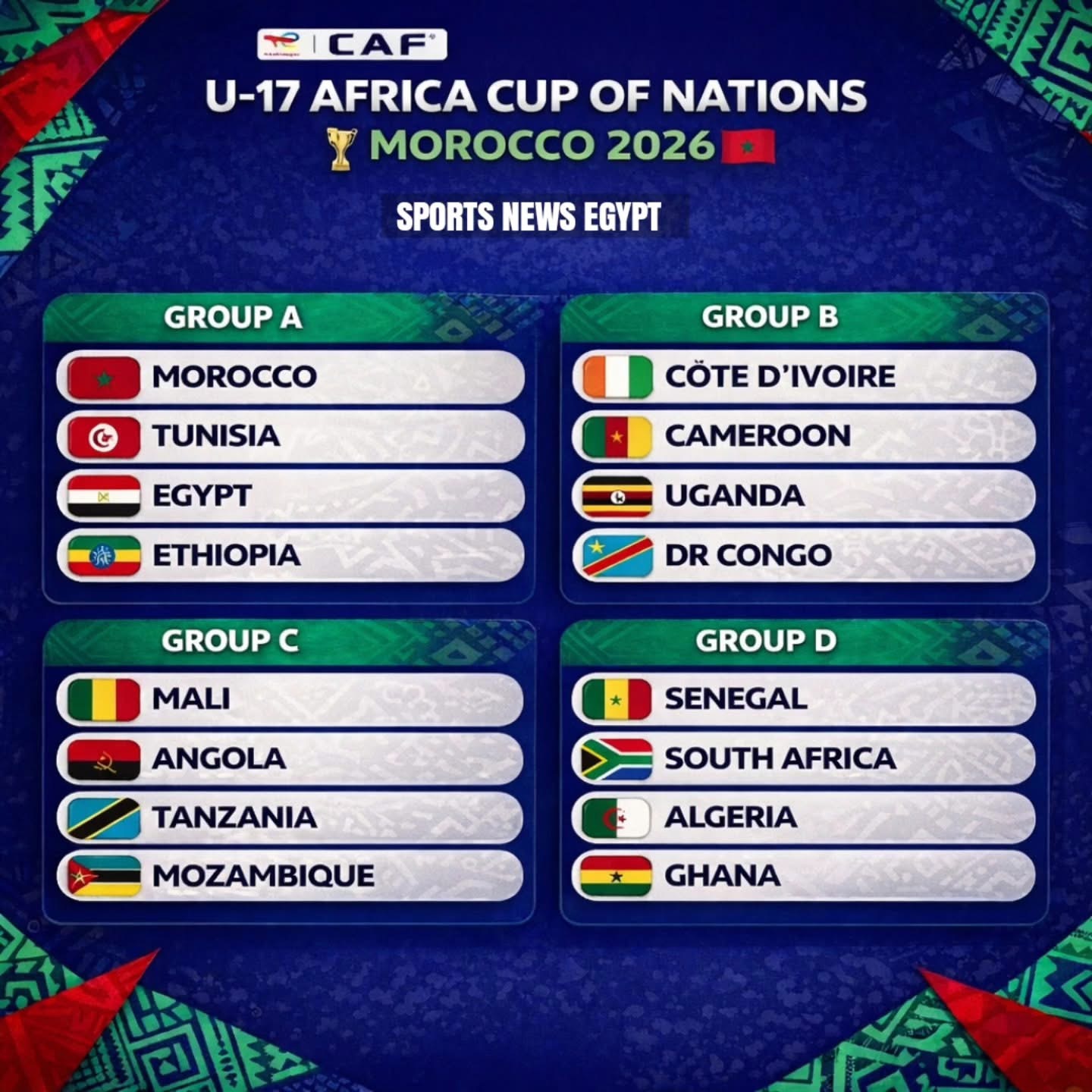 وحل منتخب المغرب، مستضيف البطولة وحامل اللقب، على رأس المجموعة الأولى، بينما تصدر منتخب مالي، وصيف النسخة الماضية، المجموعة الثالثة.
