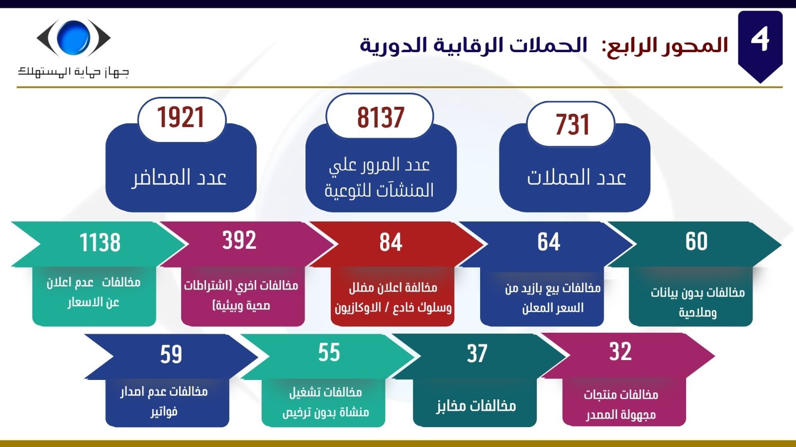 وفيما يتعلق بالمحور الأول الخاص بالحملات الرقابية، أوضح السيد/ إبراهيم السجيني، رئيس جهاز حماية المستهلك، أن الجهاز، بالتنسيق مع فروعه الإقليمية بمختلف المحافظات، واصل تنفيذ توجيهات فخامة السيد رئيس الجمهورية وتكليفات معالي رئيس مجلس الوزراء بتكثيف الرقابة على الأسواق، لا سيما أسواق السلع الغذائية، للتصدي لأي ممارسات من شأنها الإضرار بحقوق المستهلكين، وفي مقدمتها حجب السلع أو البيع بأزيد من السعر المعلن أو فرض زيادات غير مبررة.