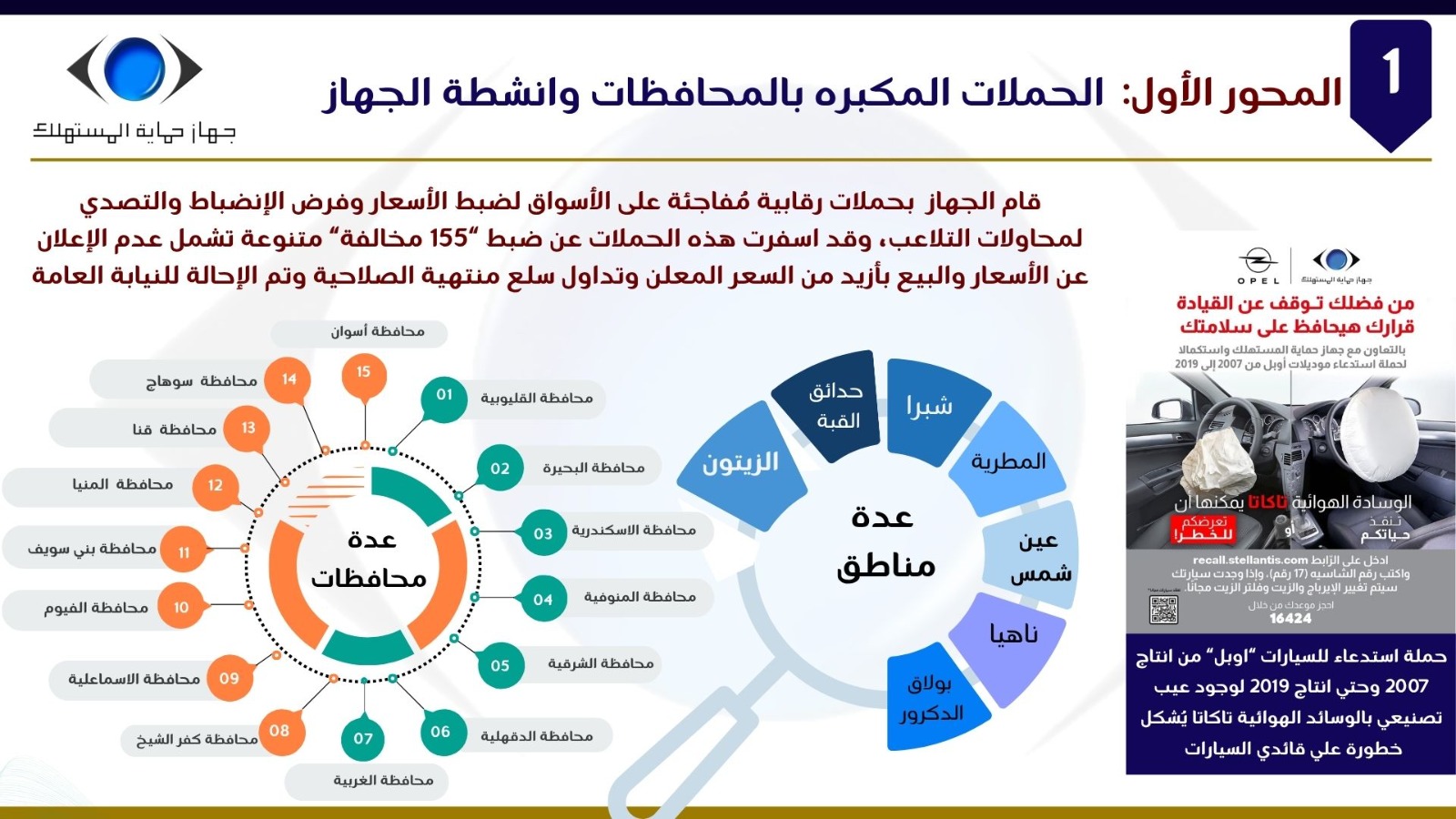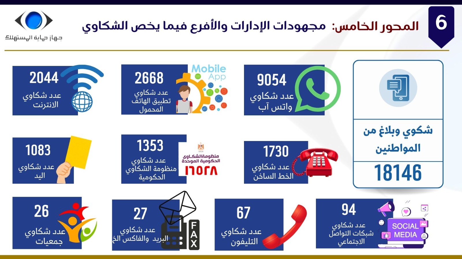 وفيما يخص المحور الثالث المتعلق بتلقي شكاوى المواطنين بمختلف القطاعات، أوضح السيد/ إبراهيم السجيني، أن الجهاز واصل تطوير آليات استقبال وفحص ومعالجة الشكاوى، من خلال منظومة عمل متكاملة تضم الإدارات المركزية والأفرع الإقليمية على مستوى الجمهورية، وتشمل قطاعات السلع المعمرة، والسلع المتنوعة، والاتصالات، والسيارات، والعقارات، والإعلانات المضللة، والخدمات، إلى جانب أعمال التحريات المرتبطة بالشكاوى.