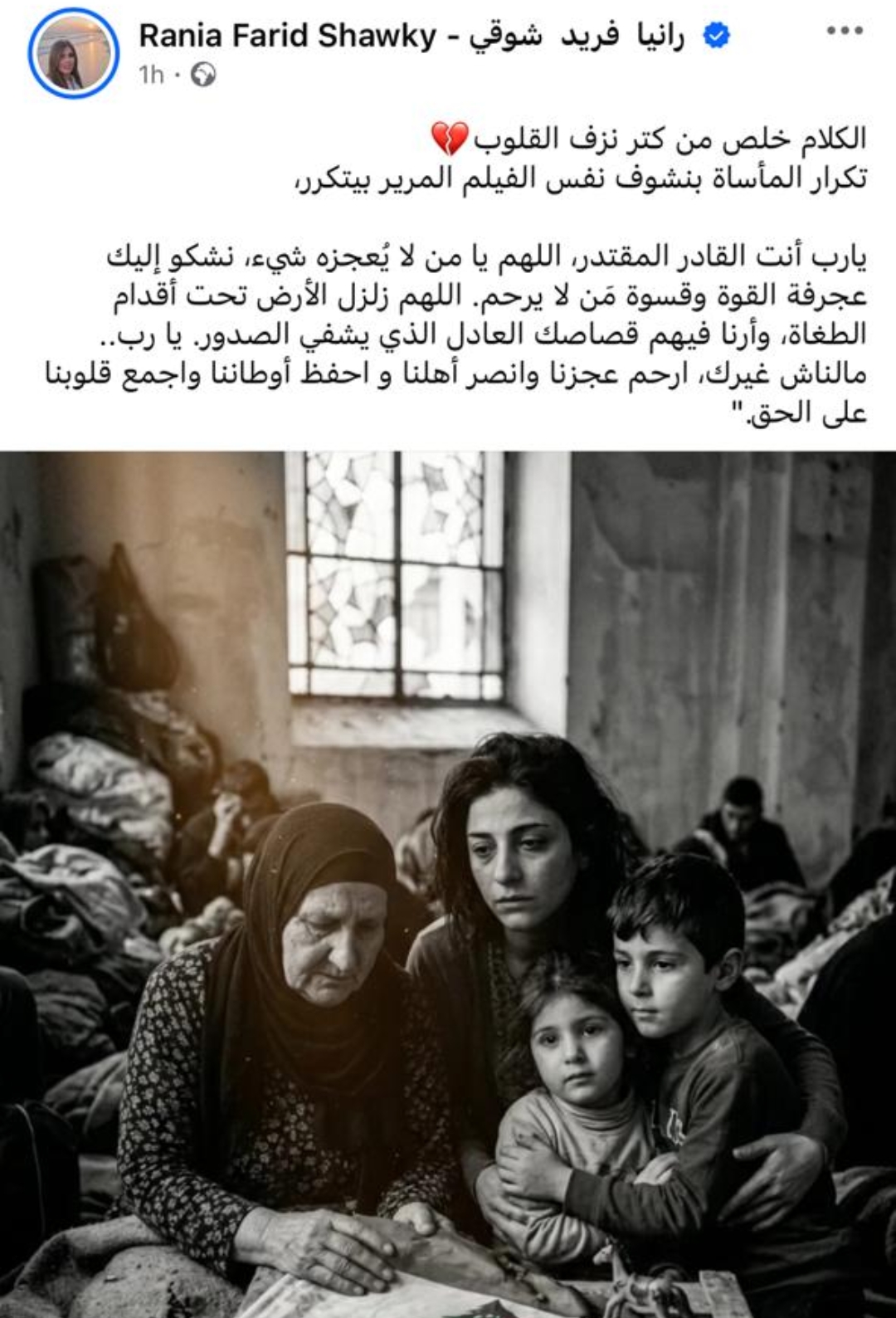أضافت: يارب أنت القادر المقتدر، اللهم يا من لا يُعجزه شيء، نشكو إليك عجرفة القوة وقسوة من لا يرحم.. اللهم زلزل الأرض تحت أقدام الطغاة، وأرنا فيهم قصاصك العادل الذي يشفي الصدور يا رب... مالناش غيرك، ارحم عجزنا وانصر أهلنا واحفظ أوطاننا واجمع قلوبنا على الحق.