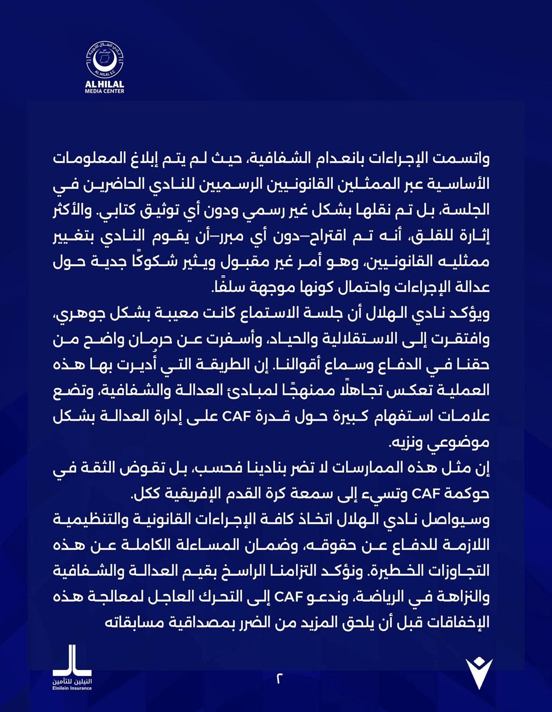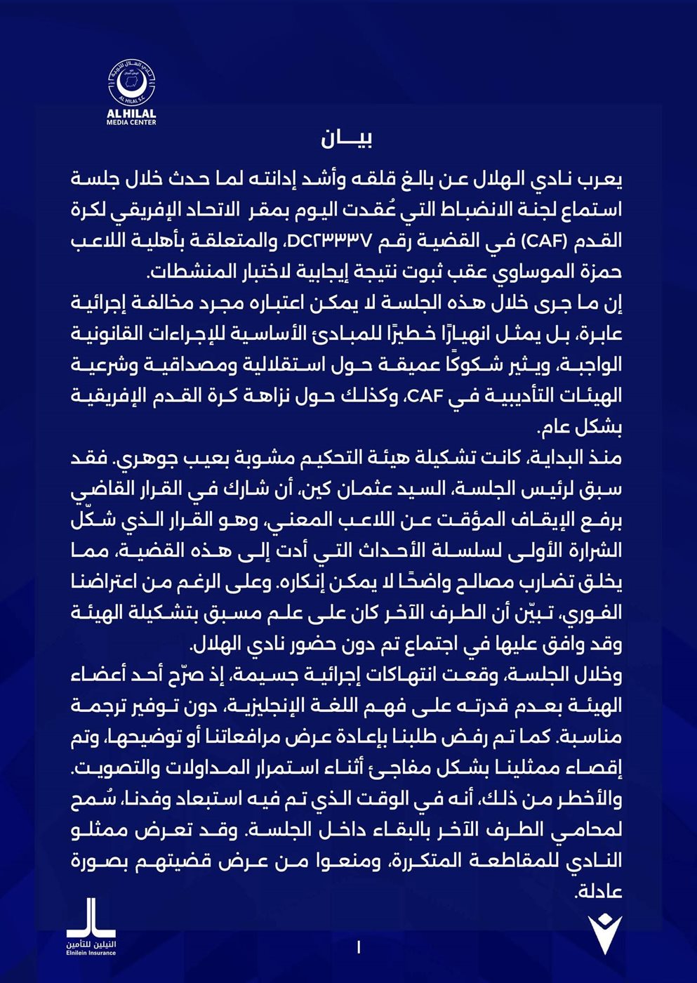 أدان نادي الهلال السواني الأحداث التي شهدتها جلسة استماع لجنة الانضباط التي عُقدت، اليوم الخميس، بمقر الاتحاد الأفريقي لكرة القدم - كاف.