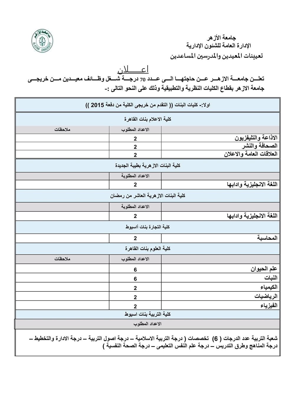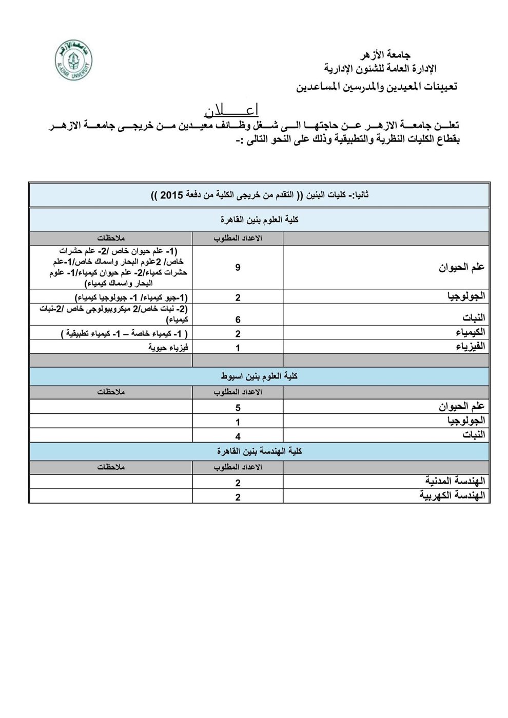 أعلنت جامعة الأزهر الشريف، حاجتها لعدد 88 وظيفة معيد بجامعة الأزهر بقطاع الكليات النظرية والتطبيقية دفعة 2014 ودفعة 2015.