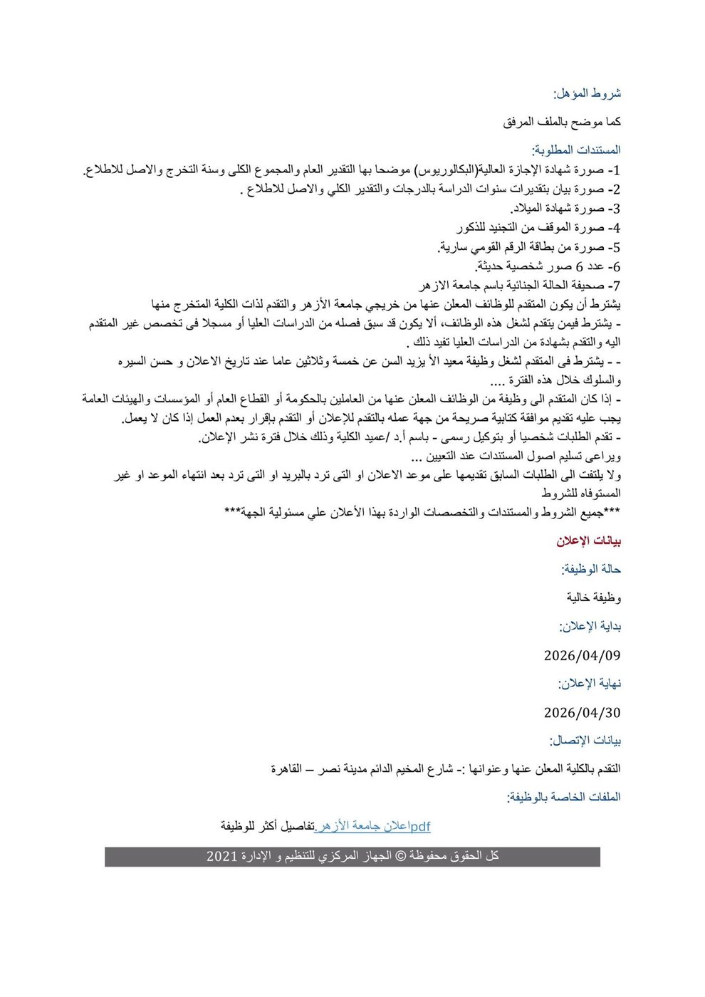 وجاء بداية الإعلان من 9 أبريل 2026 حتى نهاية ميعاد التقديم 30 أبريل 2026.