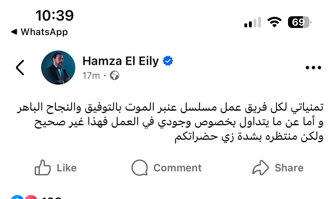نشر الفنان حمزة العيلي بيانًا توضيحيًا عبر حسابه الرسمي على موقع فيسبوك، ردًا على ما تم تداوله خلال الساعات الماضية بشأن مشاركته في عمل درامي جديد يحمل اسم “عنبر الموت”.