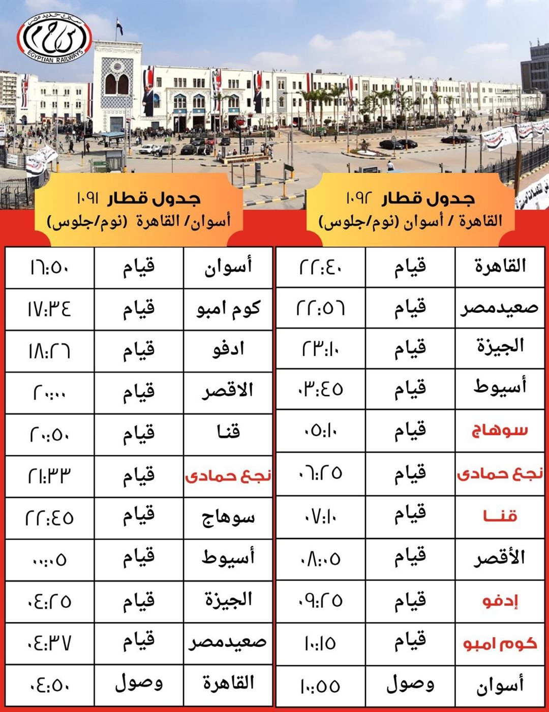 وكشفت الهيئة إضافة مقرر وقوف لقطاري رقم (1092 – 1091) مكيف (نوم / جلوس) على خط القاهرة – أسوان والعكس، بعدد من محطات الوجه القبلي، وذلك اعتبارًا من يوم السبت الموافق 11 أبريل 2026، وفقًا للجداول التشغيلية المعتمدة.