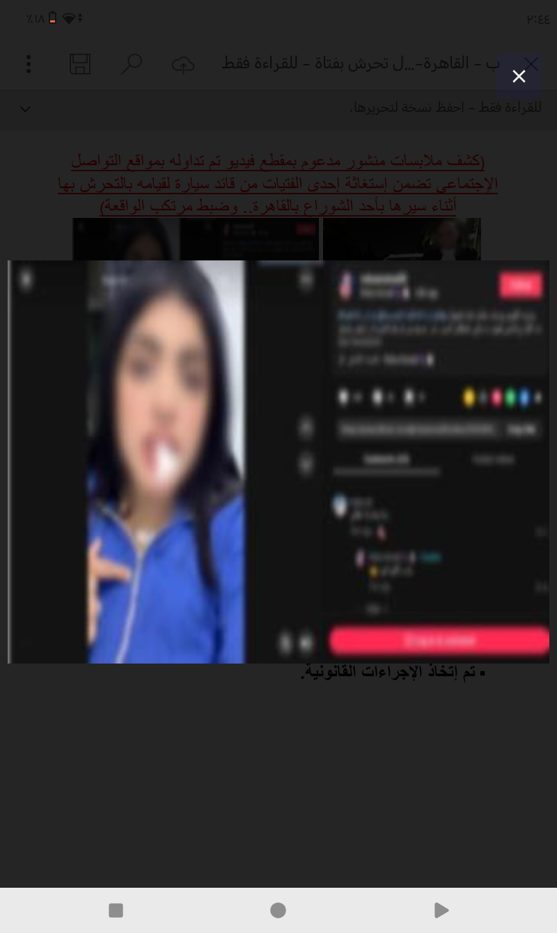 بالفحص، أمكن تحديد القائمة على النشر، مقيمة بدائرة قسم شرطة الوايلى، وأقرت بتضررها من قيام قائد سيارة ملاكى بالتحرش بها لفظيًا حال سيرها بدائرة القسم، من خلال محاولة إقناعها باستقلال سيارته.