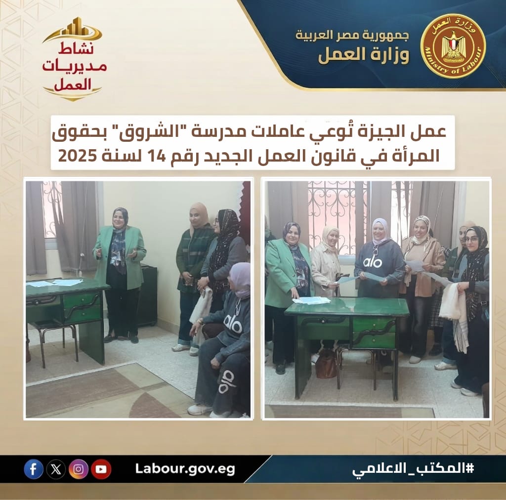 13- "عمل الجيزة" تُوعي عاملات مدرسة "الشروق" بحقوق المرأة في قانون العمل الجديد رقم 14 لسنة 2025