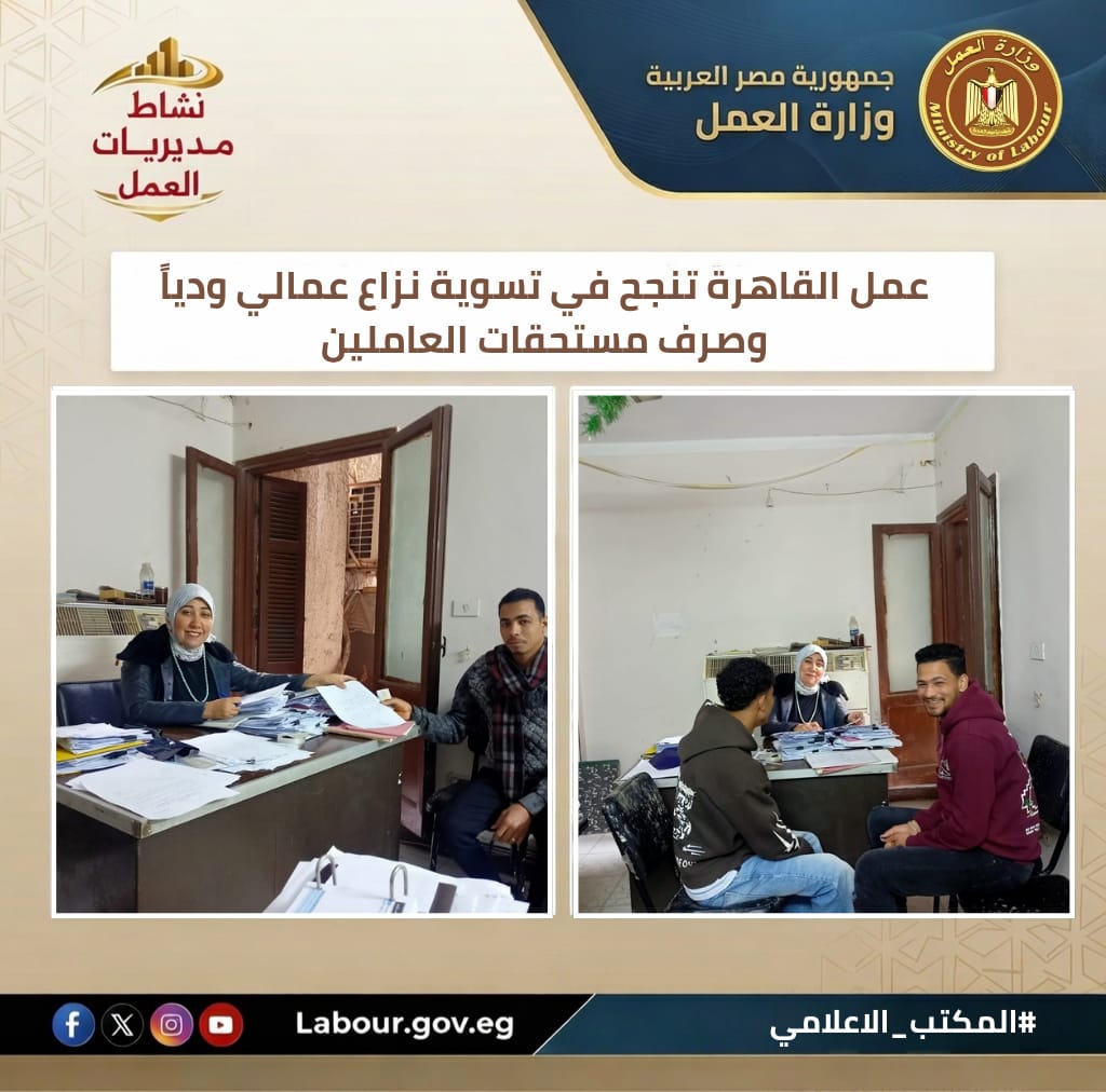 6- "عمل القاهرة" تنجح في تسوية نزاع عمالي ودياً بشركة "العلاء" وصرف مستحقات العاملين