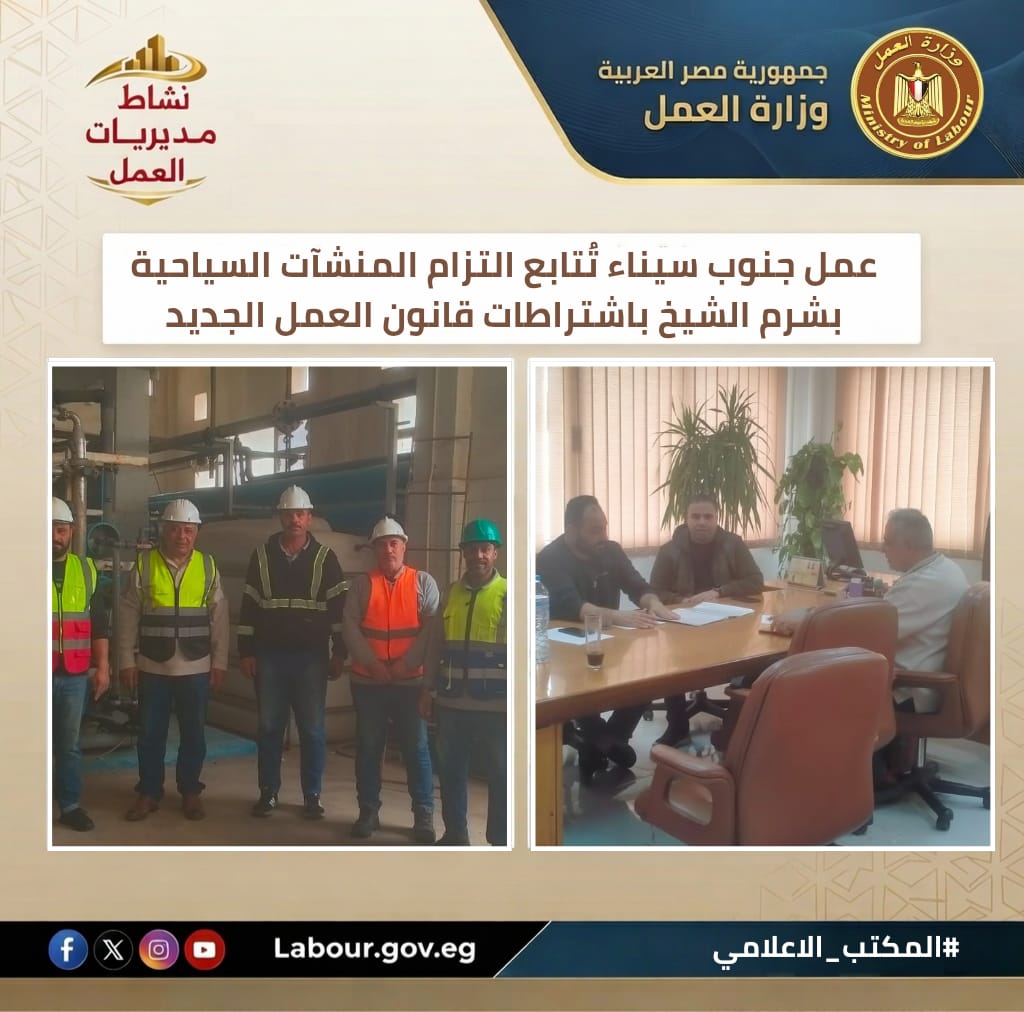 3-"عمل جنوب سيناء" تُتابع التزام المنشآت السياحية بشرم الشيخ باشتراطات قانون العمل الجديد
