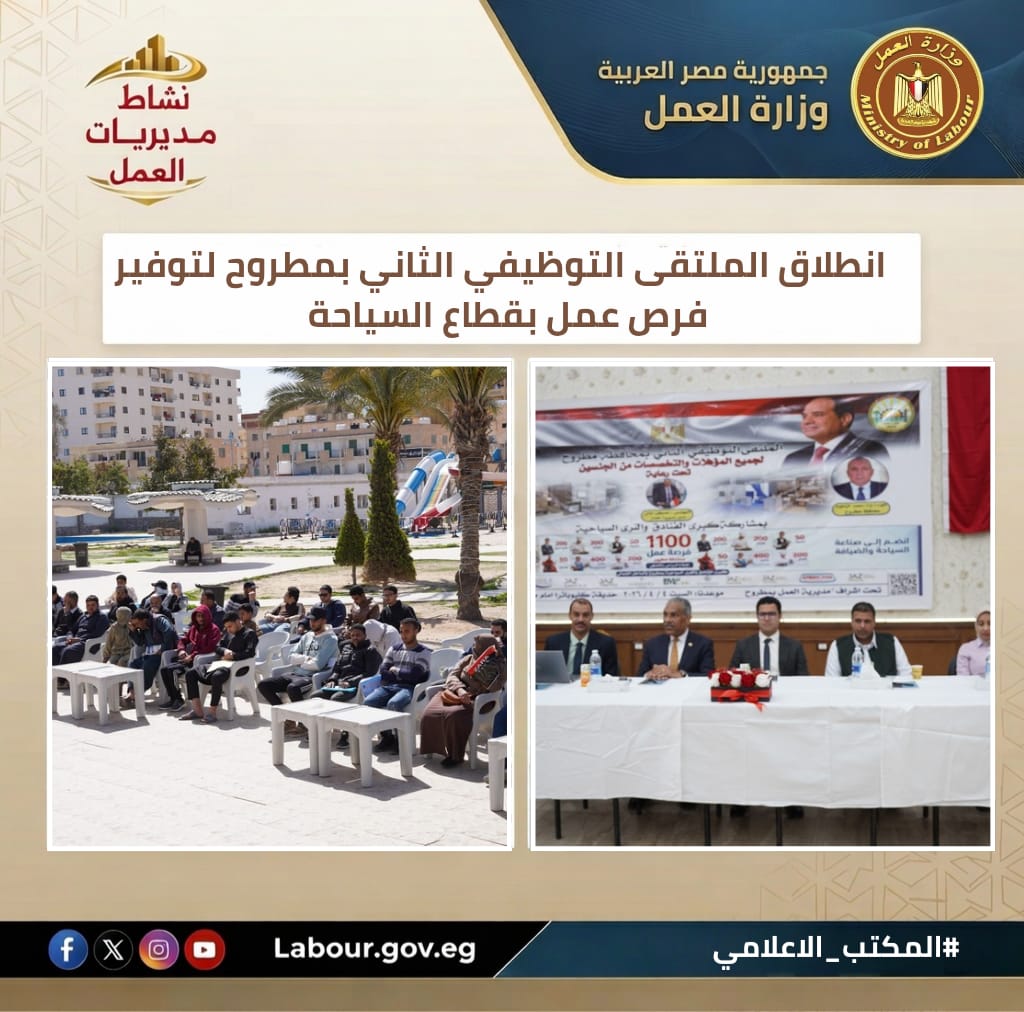 تنفيذاً لتوجيهات الوزير حسن رداد؛ افتتحت مديرية عمل مطروح فعاليات الملتقى التوظيفي الثاني للأنشطة السياحية، برعاية المحافظ اللواء الدكتور محمد الزملوط وحضور نائبه الدكتور إسلام رجب. شهد الملتقى مشاركة كبرى المجموعات الفندقية (ألماظة، البوسيت، كارلوس، ريفيرا، كليوباترا، وأمريكانا)، والتي قدمت مئات الفرص المباشرة لشباب المحافظة في مختلف التخصصات. وأكدت المديرية أن هذا الملتقى يمثل منصة تنفيذية تربط الشباب بسوق العمل الفعلي، معززةً التعاون المثمر بين الدولة والقطاع الخاص لتحقيق الاستقرار الاقتصادي والتمكين المهني لأبناء مطروح تماشياً مع رؤية مصر 2030.