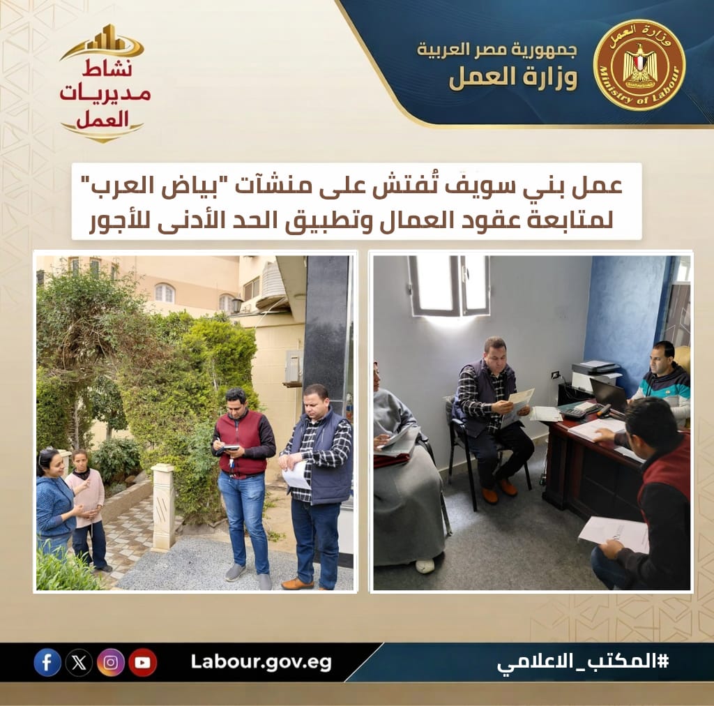 7-عمل بني سويف تُفتش على منشآت "بياض العرب" لمتابعة عقود العمال وتطبيق الحد الأدنى للأجور